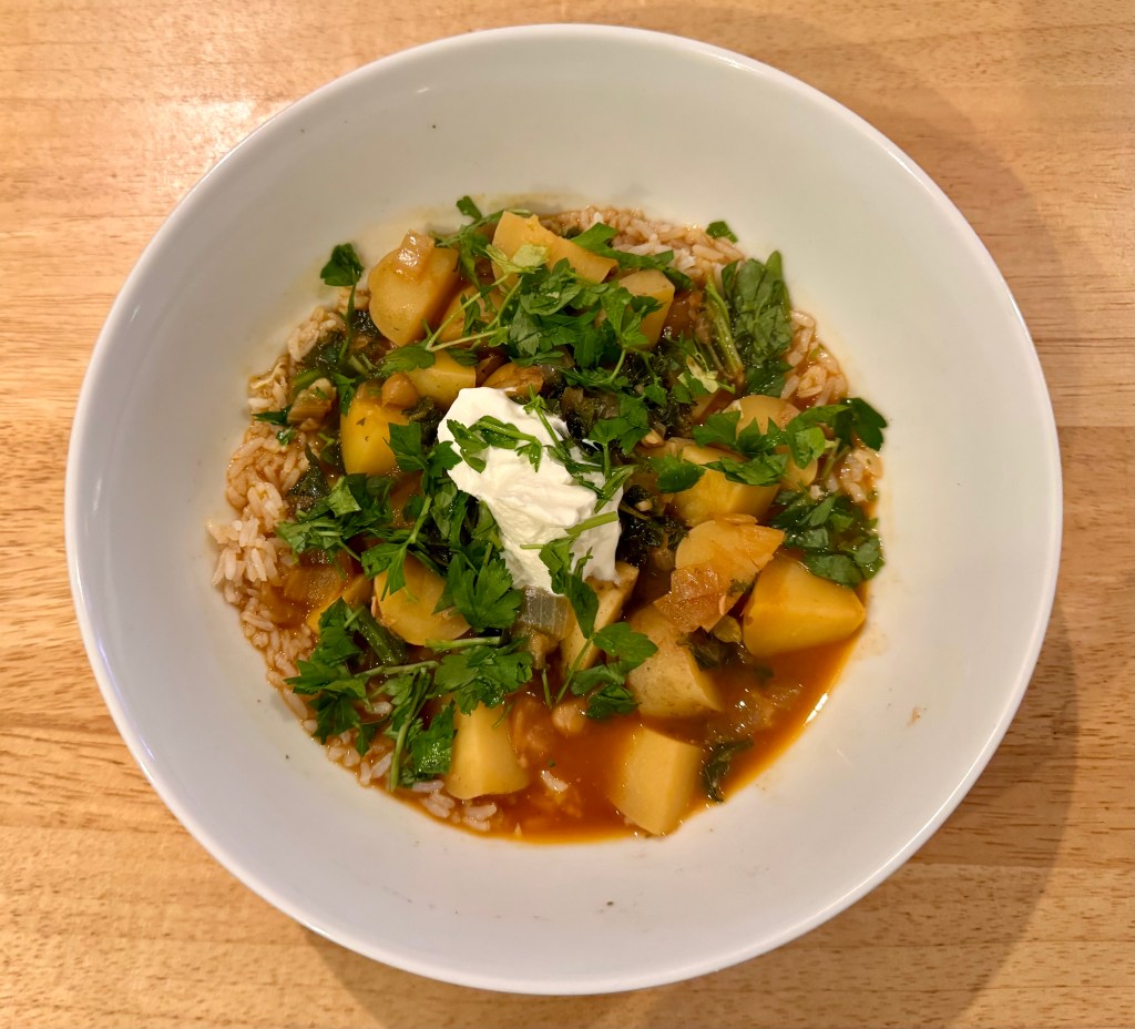 Ras el hanout chickpeas and greens with yogurt and rice