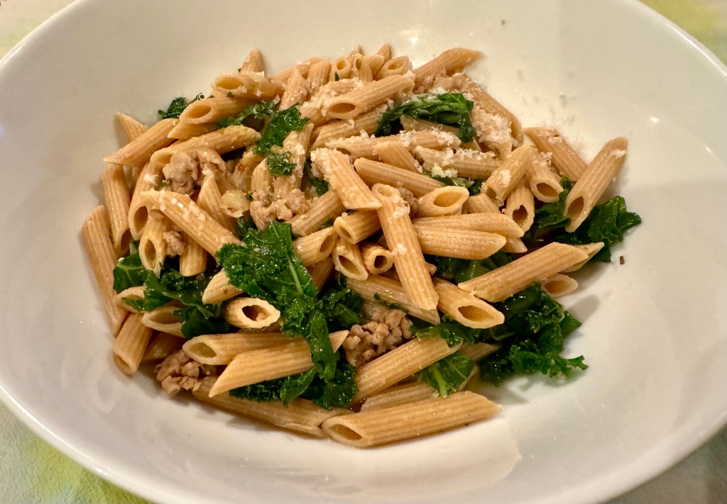 I made this pasta recently and we both liked it so much I made it again. My secret? Bring a pot of salted water to a boil and add the pasta. Put small broccoli florets in a colander and when the penne is al dente, reserve a half cup of the pasta water, and then pour the water and the penne over the florets in the colander. Put everything back in the pot and add olive oil and some reserved pasta to make a little sauce. All you need now is grated parmesan and you are done.