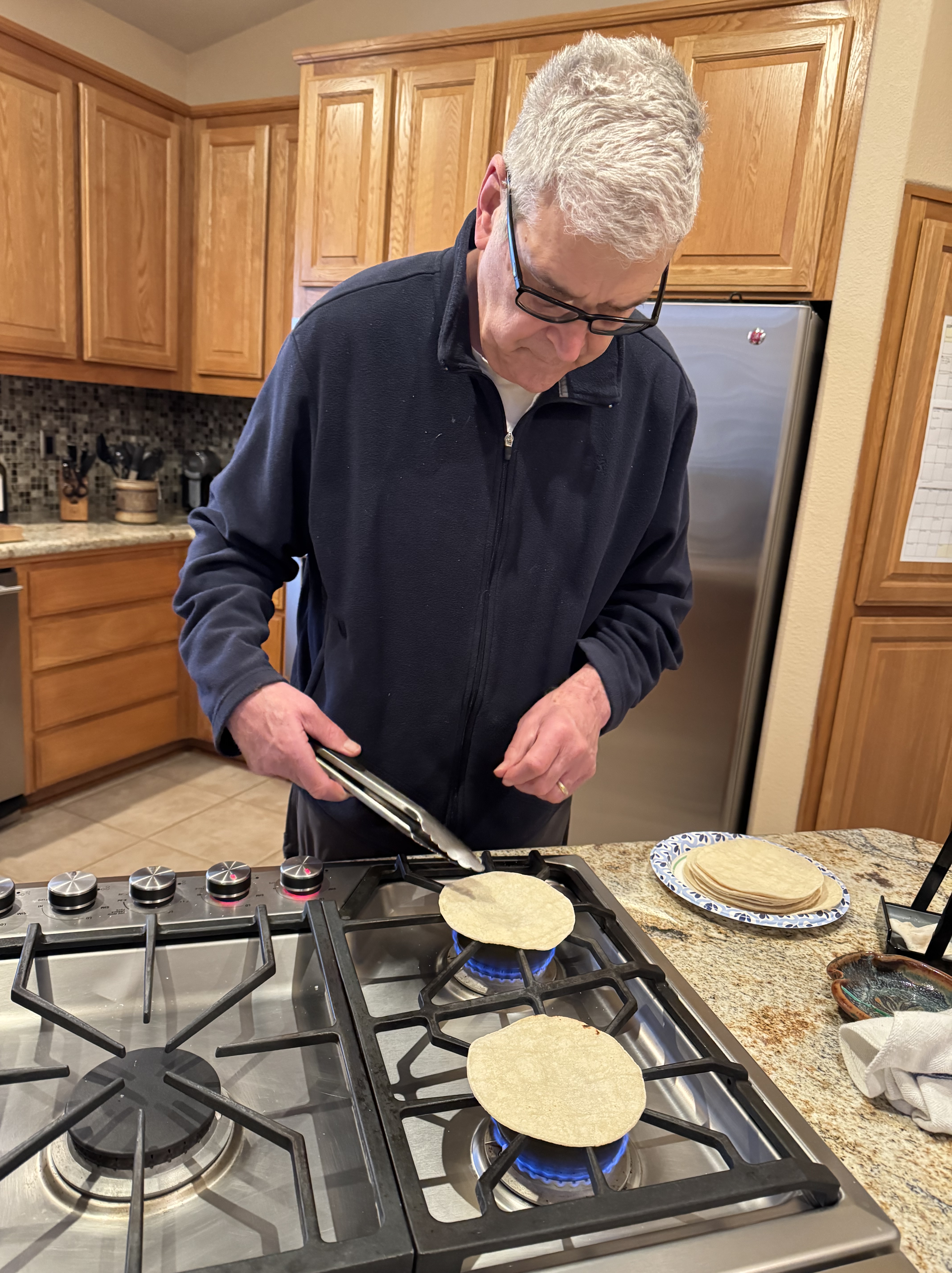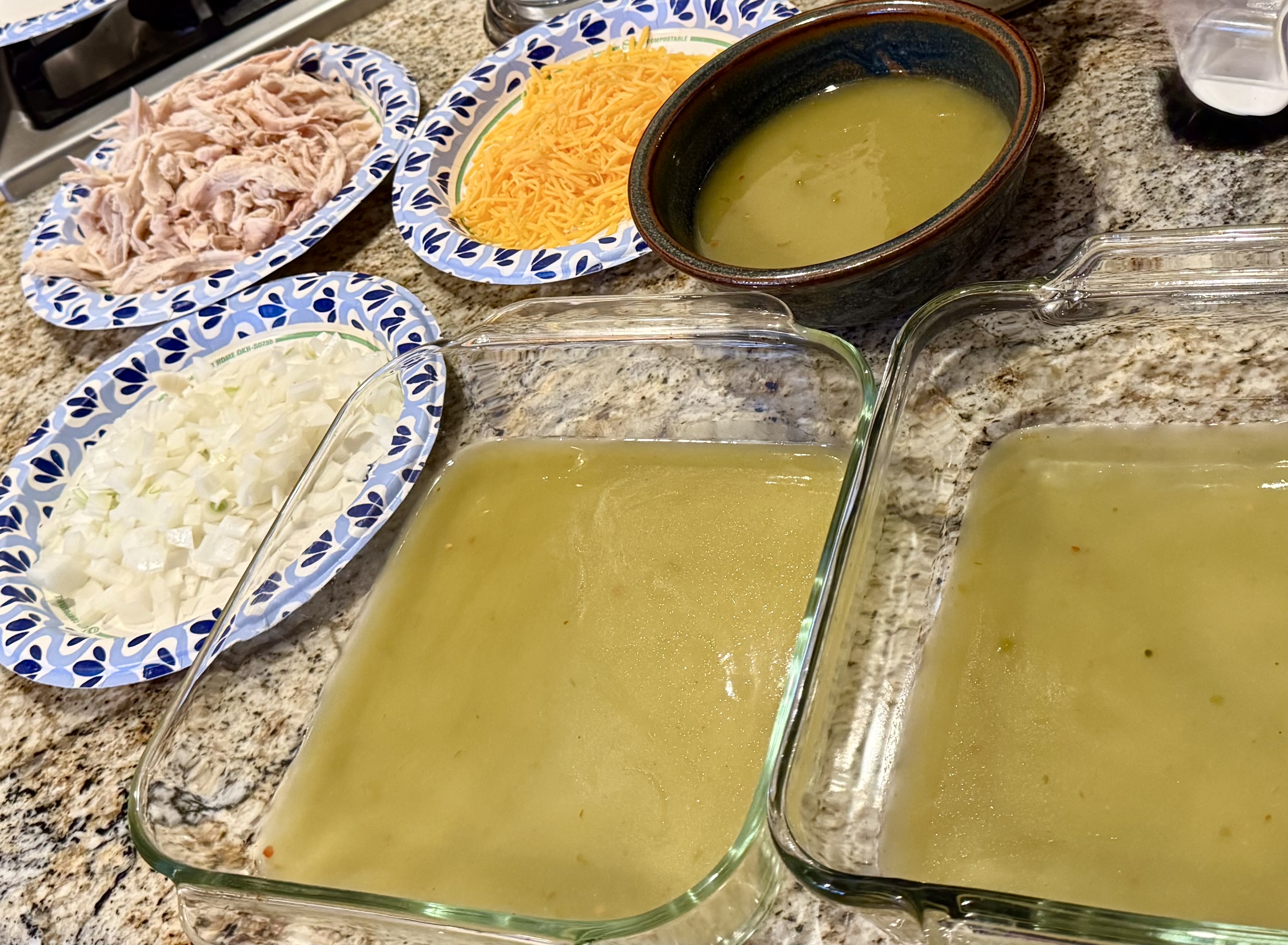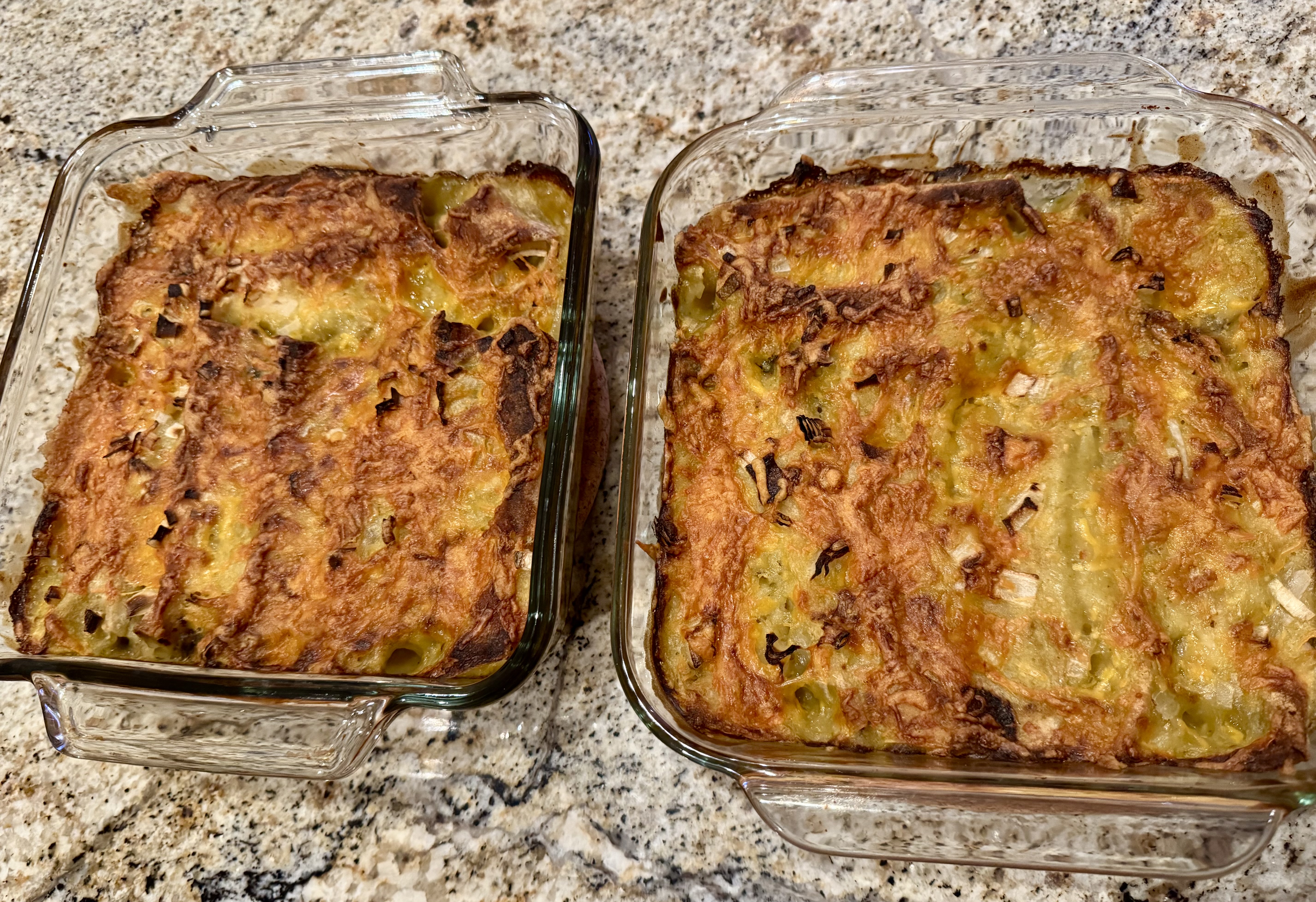 Ingredients for two servings – 6 to 8 oz. whole grain penne, 1/2 onion, chopped, 3 garlic cloves, minced, 4 oz. spicy pork sausage removed from casing.
