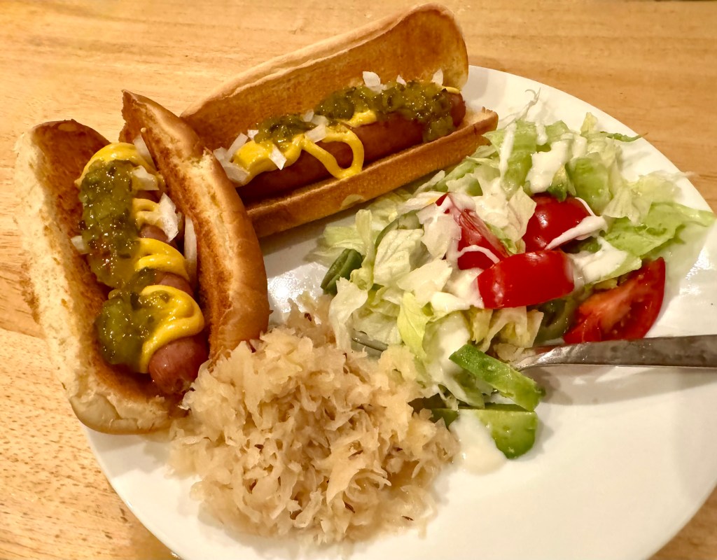 I bought a bag of four good-sized peppers and stuffed them with a cooked mixture of onions, ground beef, rice, spices, and tomato sauce. They were good on Tuesday but even better as a leftovers on Thursday.