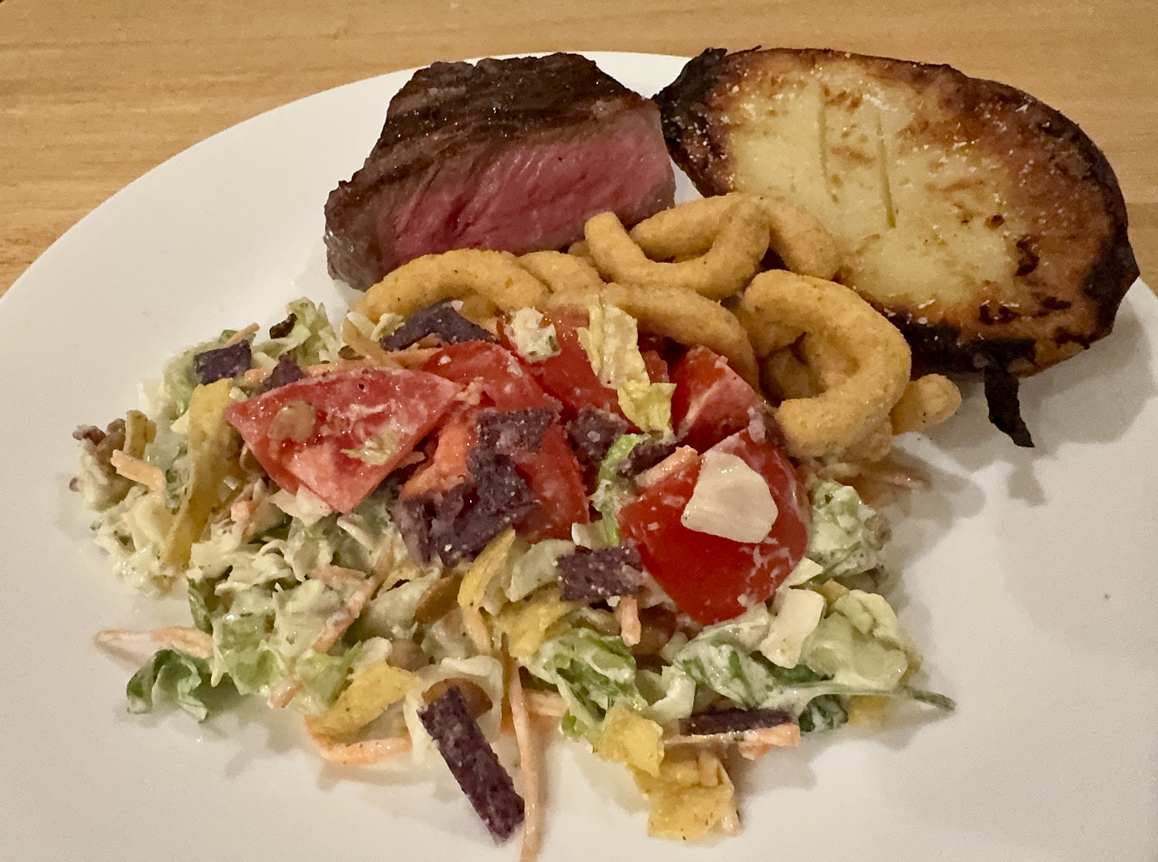John was in charge or grilling the steak and the potato halves. I had microwaved the potato in advance so it just needed salt and olive oil plus a quick sear on the grill. I also made up the Taylor Farms Southwest Salad which I embellished with a cut up tomato and puffed onion petals.