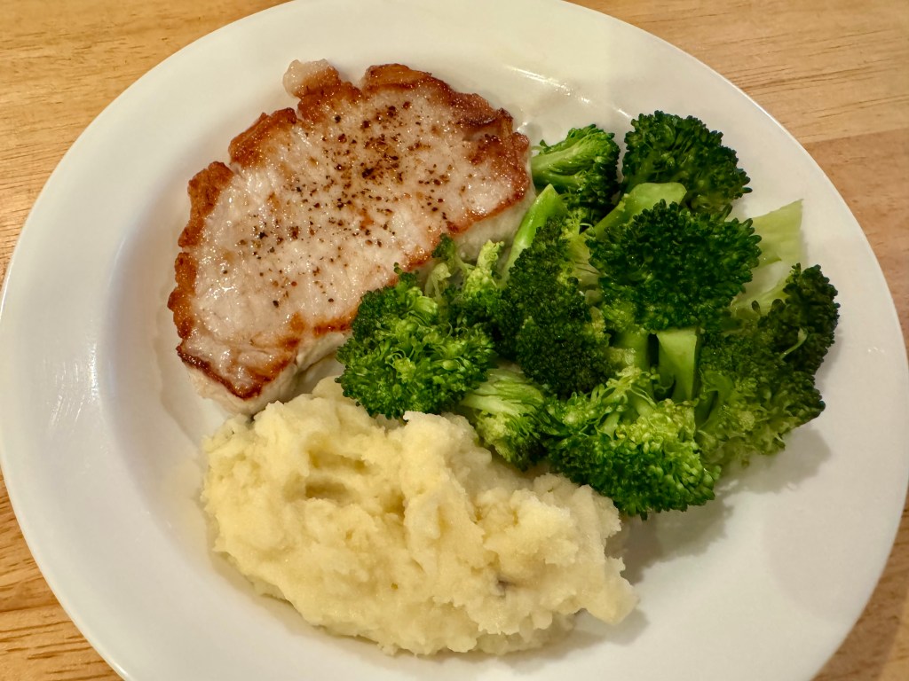 We don’t have pork often because “the other white meat” is so devoid of fat that it is almost impossible to cook it without drying it out. I was really feeling like trying pork again so John reluctantly went to the store with me to try to find something that looked appealing. We got a package of center cut loin chops which appeared to have some fat running through it and John cooked the chops on the stovetop very quickly. It came out pretty okay. Certainly for $3.91 it made a very economical dinner especially compared to steak which would have cost around $20! Maybe we will try it again some time.