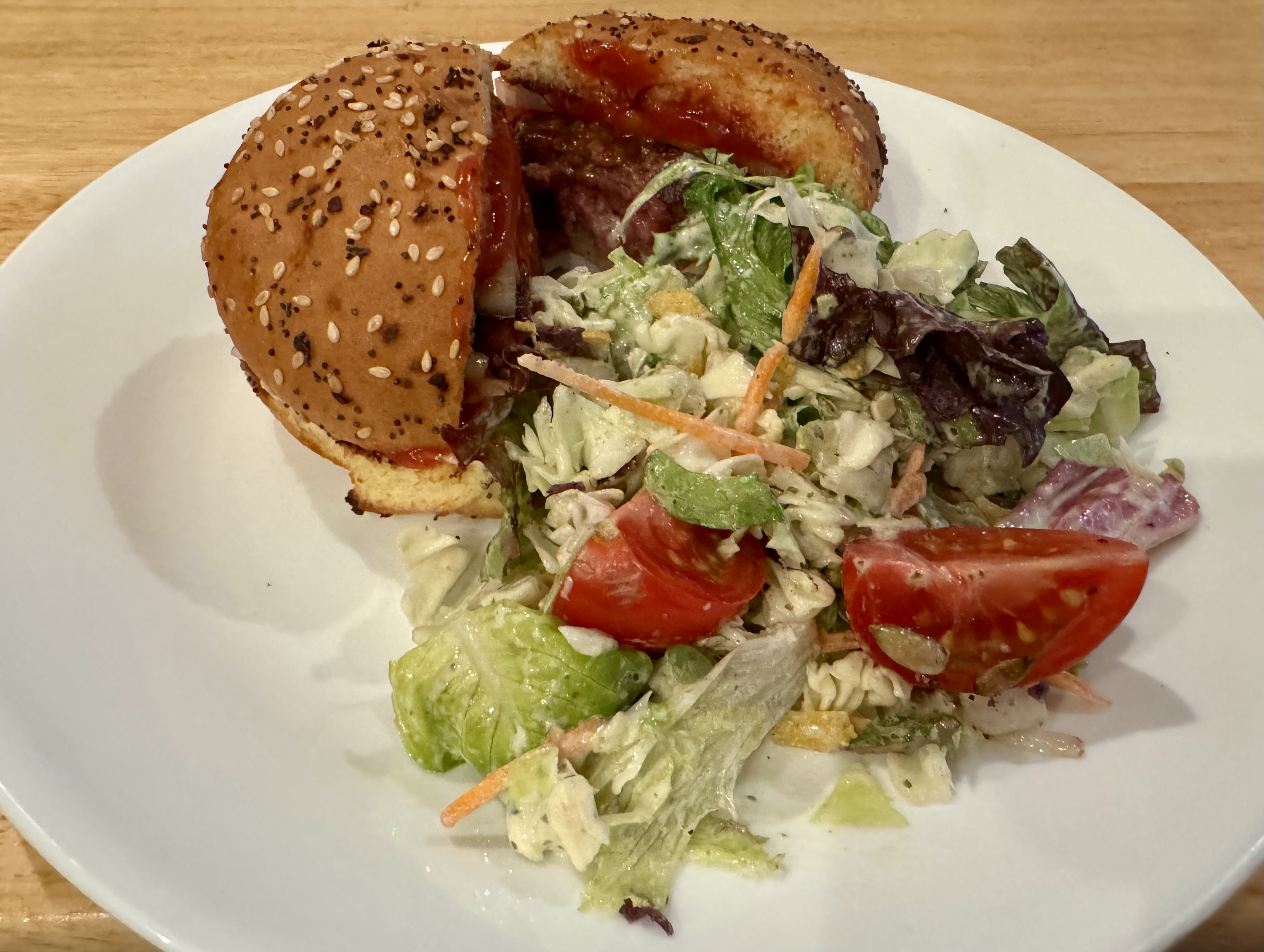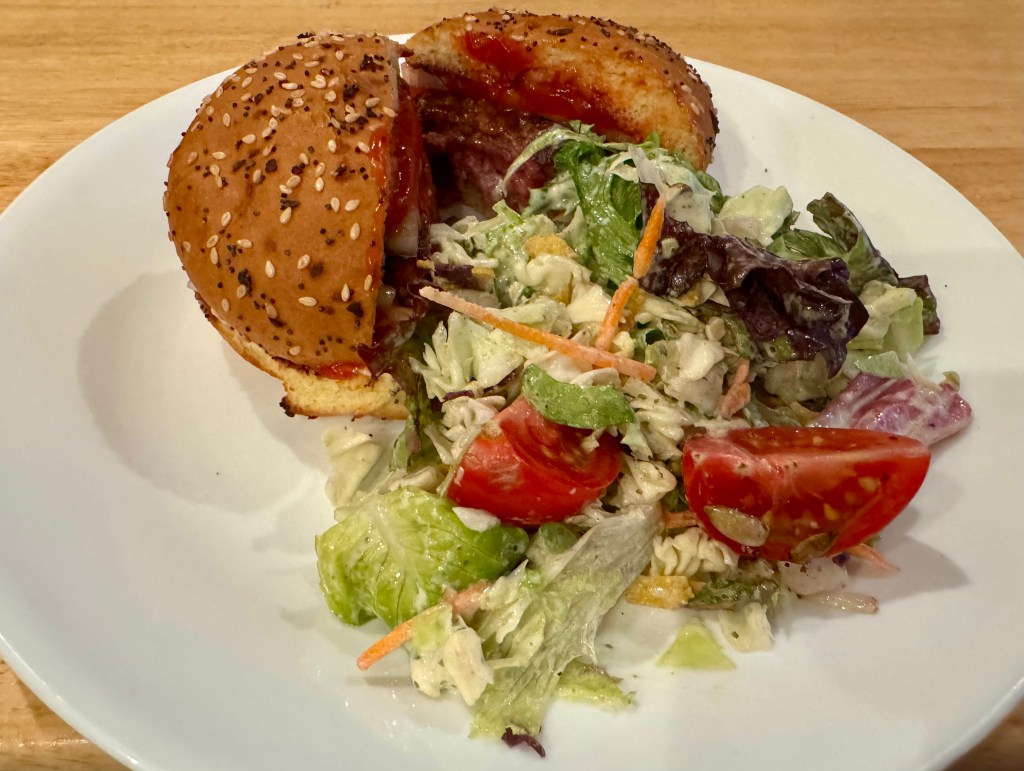 It is always enjoyable to eat one of John’s perfectly grilled hamburgers with my favorite fixings, mayo, ketchup, and onion! I helped out by making a salad. It feels like summer is almost here!