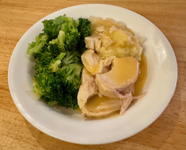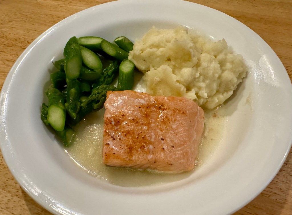 As usual I take care of cooking the veg. Tonight is the last night for the mashed potatoes that I bought in the refrigerated section of Costco. We certainly have gotten a lot of meals out of them. I cook the asparagus in a little water and a teaspoon of butter. I cut up the asparagus tonight. Asparagus looks more elegant left whole but I can get two dinners out of chopped up asparagus. With the price of food being inflated, I like to get a little go a long way!