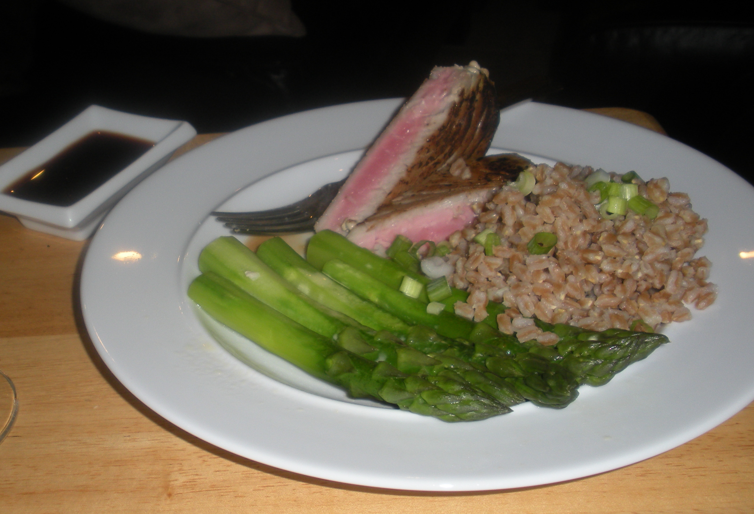 Seared tuna, asparagus and farro with green onions