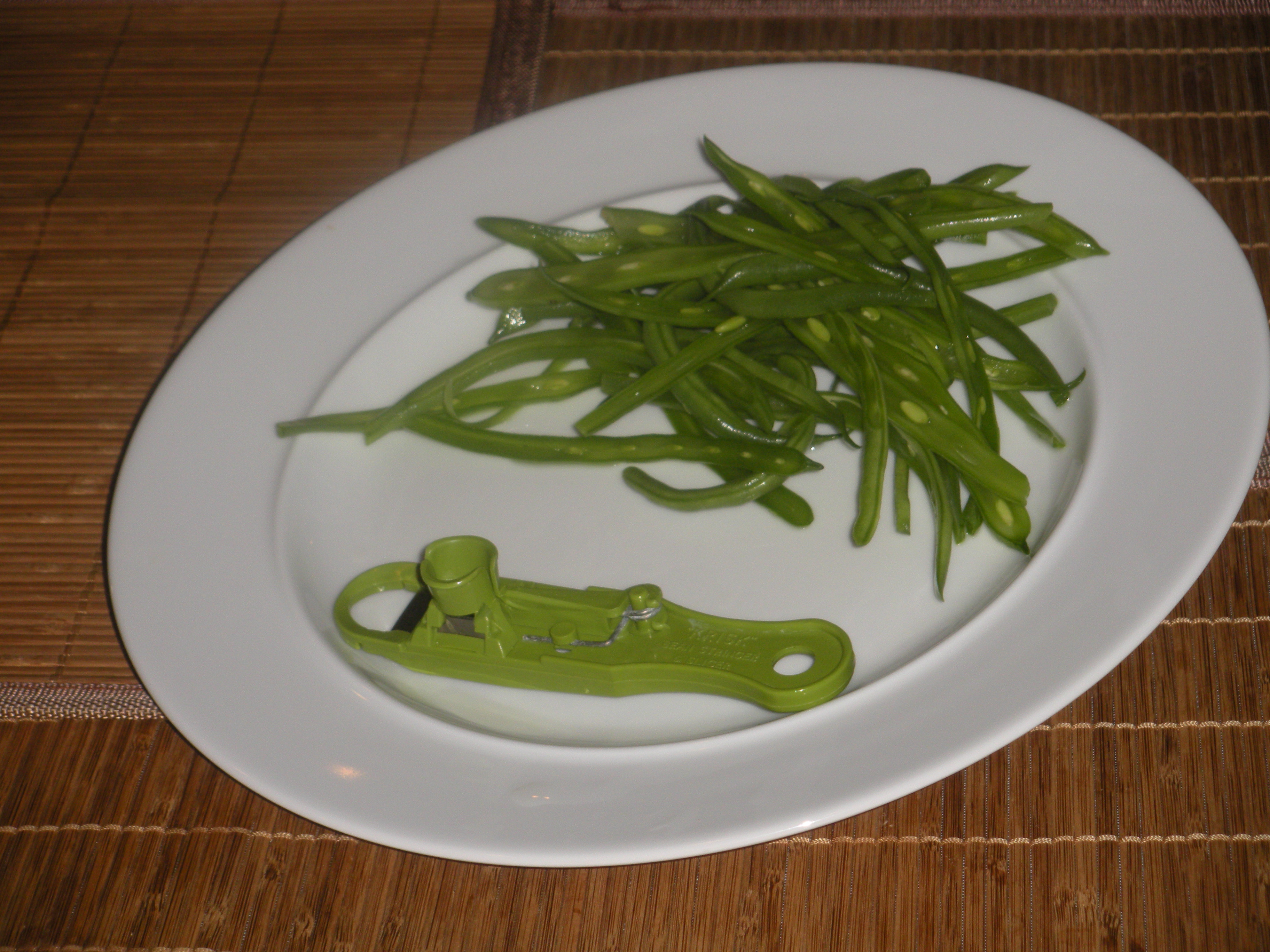 I love haricot vert but they are not always available at my local grocery store. Trader Joe’s has them but Trader Joe’s is a schlep across town. So if I get beans from my local supermarket that look like they’ll be tough and fibrous, I run them through my frencher. (I don’t know if frencher should be capitalized or not). The frencher splits them lengthwise in two or three pieces while simultaneously stripping off the “string” area of the string bean. The beans turn out tender, quick to cook and yummy. A frencher can be bought at any good kitchen supply store.