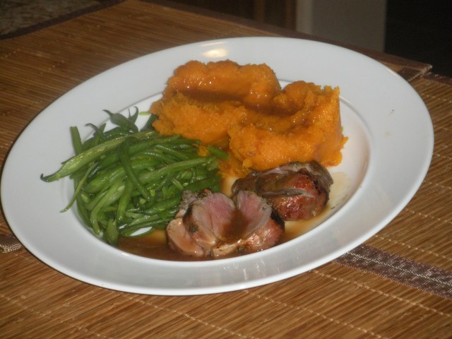 Without an extensive search of my photo archives, I needed to come up with a photo for today. This is good for me because it makes me create a winning dinner. Although John did a great job on the pork by cooking it in a really slow oven and then searing it for a crust and I spent time frenching the green beans, the real star of the dinner was the butternut squash. After John split the squash and gutted the seeds, I roasted it in a 400 degree oven for about an hour and then scraped out the flesh. The butternut squash was enhanced by salt, pepper, nutmeg and some butter spray. The squash itself happened to be exceptional tasting. Sometimes you just need to let the vegetable speak for itself.