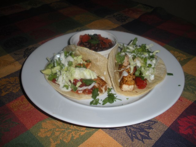 The fish is frozen ono that you get from Costco. It’s seasoned and quickly cooked in a pan that’s been sprayed with olive oil spray. The tortillas are corn. The condiments are fresh salsa from the grocery store, shredded cabbage, green onions, cilantro and crema made from nonfat yougurt, salt and cumin. The beans are canned. I enhanced them with some of the salsa and cumin. Pretty easy. Really good.