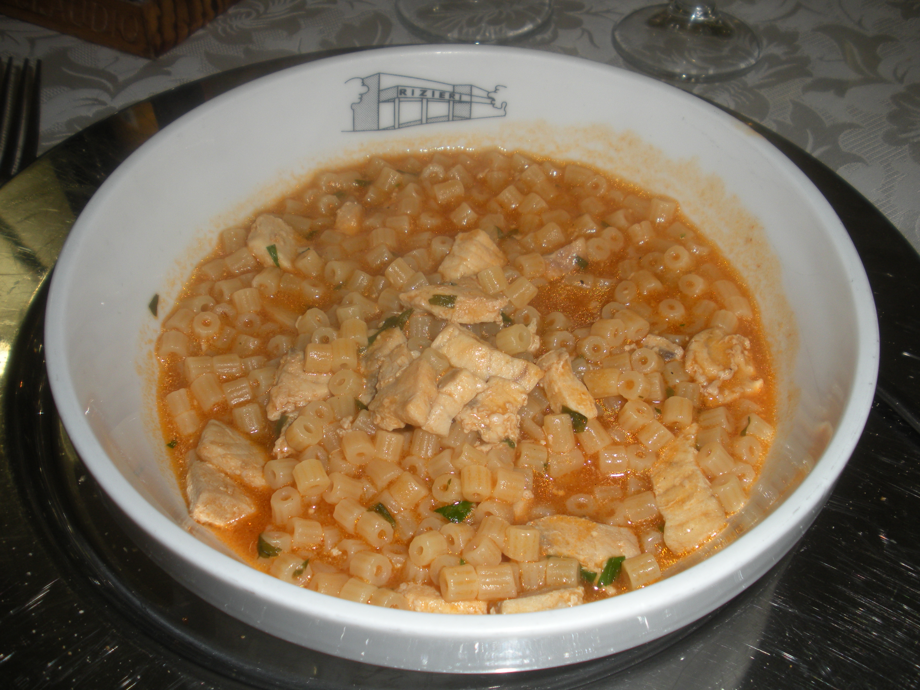 Along with a salad, this tubettini con spada was our lunch down at the very bottom of the heel of Italy. It was in a light sauce. The small tubes were like ditalini but were striated like penne rigate. John added olive oil as a top dressing. I did not. It was good and filling. It was served with a spoon so I imagine it is considered more of a soup than a pasta.