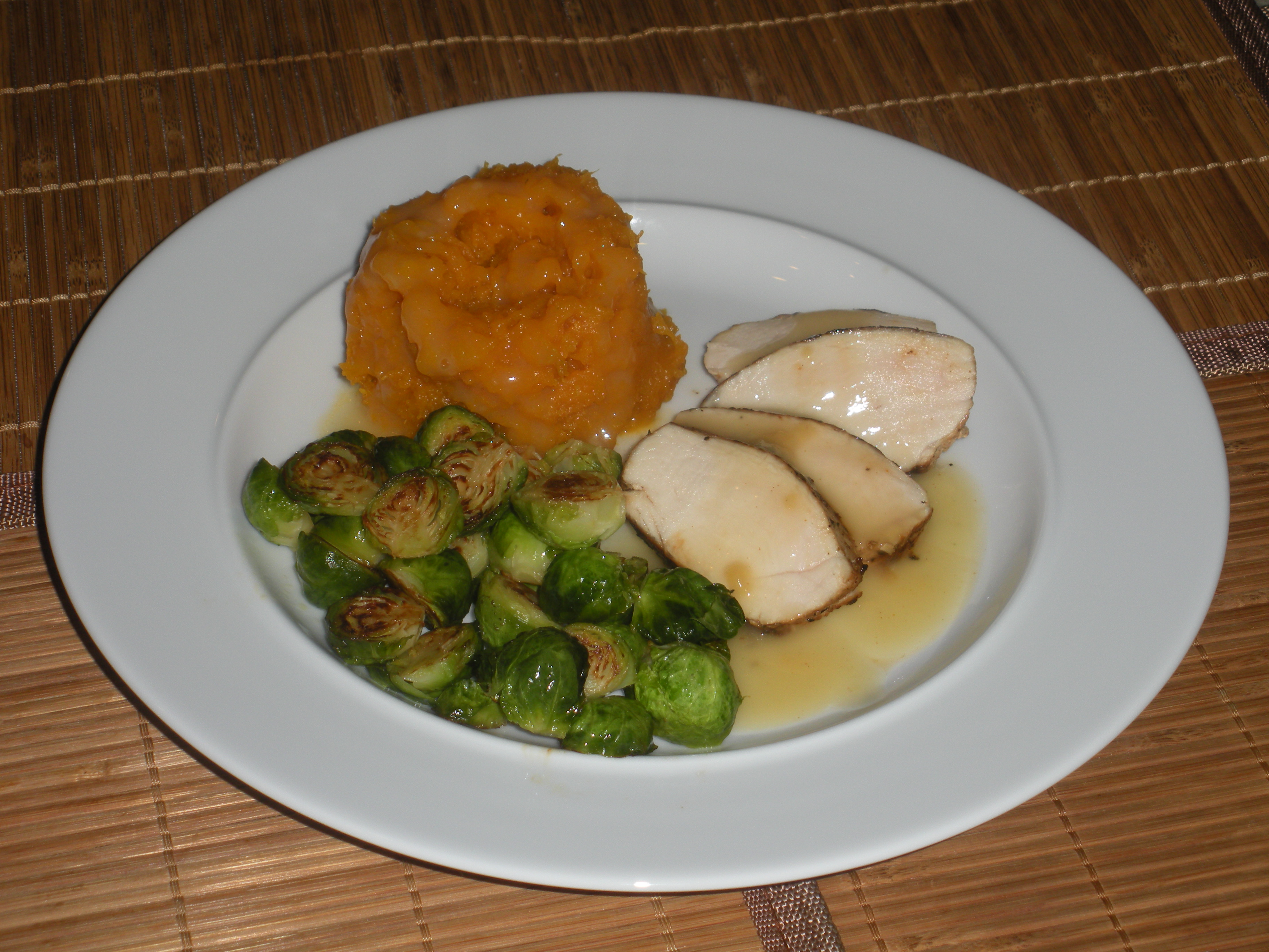 Anyway, I guess the tradition continues because if I ask John what he wants to eat on a Monday, he’ll say, “well, it’s Monday isn’t it? Let’s have chicken.” This past Monday as we were struggling to get back on the diet track we had pan roasted chicken breasts with roasted butternut squash and sauteed Brussels sprouts. I also made up a packet of chicken gravy mix.