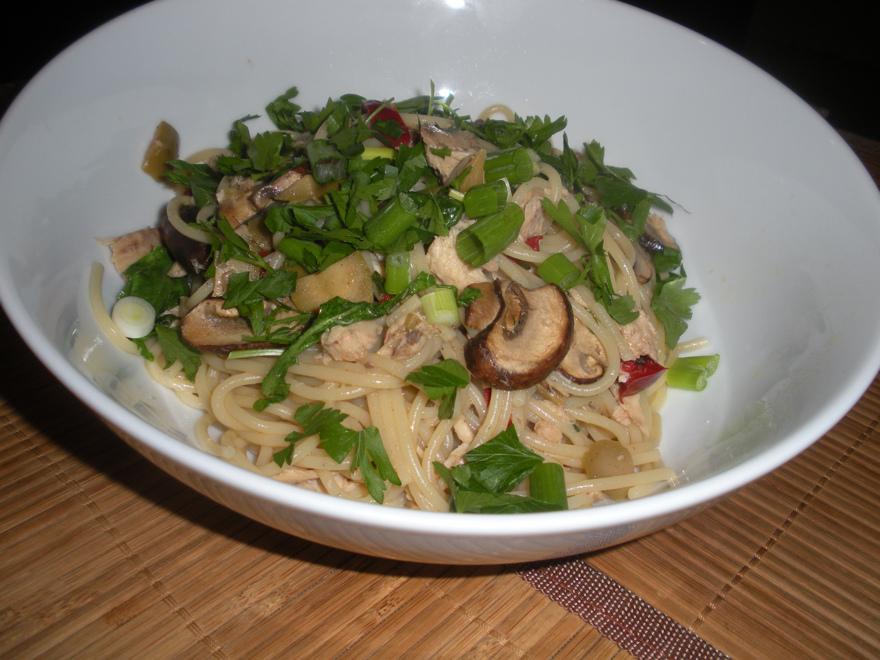 While I cut up some of the vegetables, John sauteed the mushrooms. He boiled the pasta and added some chicken stock after he drained it. Then we added the tuna, mushrooms, arugula and olives to the hot pasta. We dished it out and added a topping of green onions and parsley. A drizzle of olive oil and it was done. An easy, inexpensive dinner made in about twenty minutes that was tasty and soul satisfying.