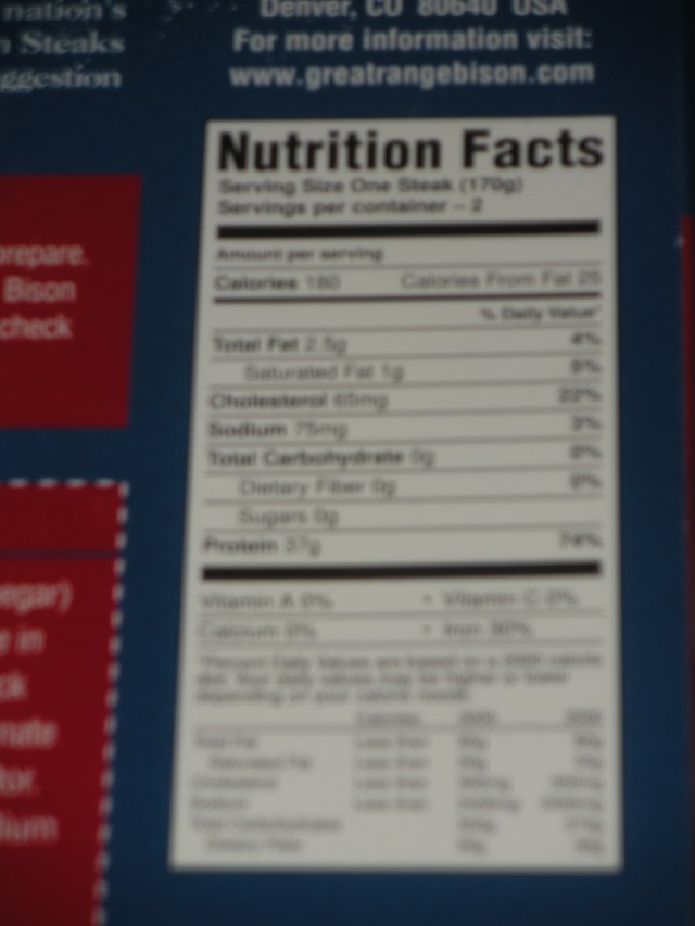 I know the picture is a little blurry but for each 6 ounce portion of bison the calorie count is 180 and there are 2.5 grams of fat. That is way low. Fish low. The bison doesn’t taste quite like beef and it is definitely a little chewier. But the overall impression is similar.