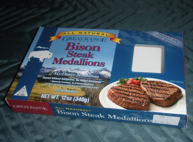 As promised, here is the exotic meal of the week. This year I think I have had beef twice. So finding a low calorie alternative is a good thing. We bought these bison medallions in the freezer case at Whole Foods.