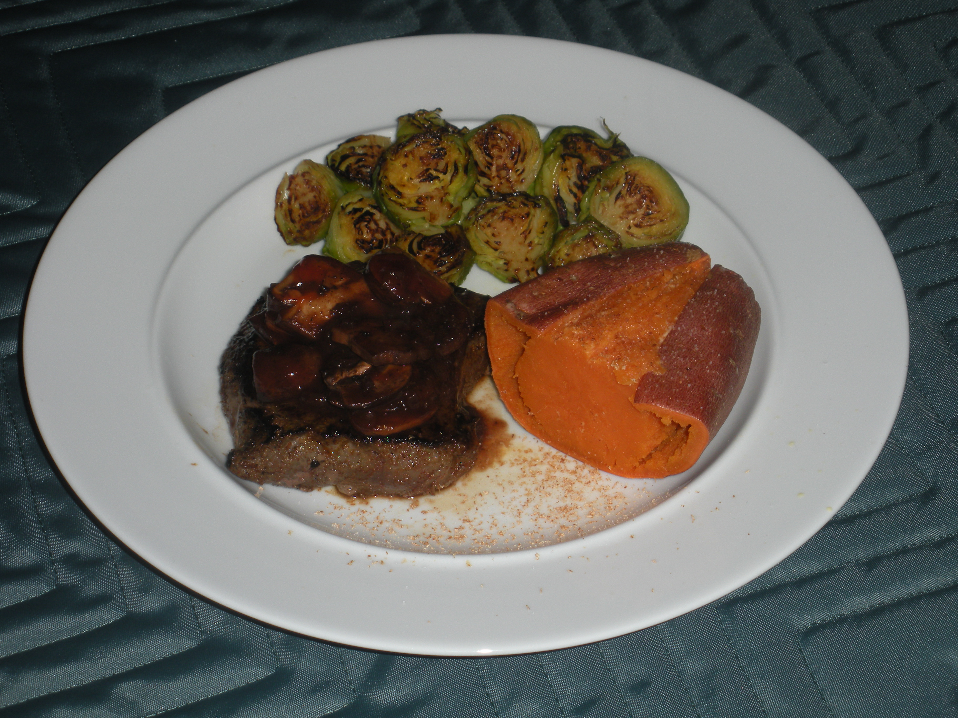 In the meantime, I microwaved the sweet potato and then finished it with butter spray, salt, pepper and freshly ground nutmeg. I cooked the Brussels sprouts, halved and cut side down, in a smidge of water and 2 teasponns of lowfat butter substance. They were seasoned with salt, pepper and a little sugar. Dry sherry was added as the water evaporated. Then they were left to brown.