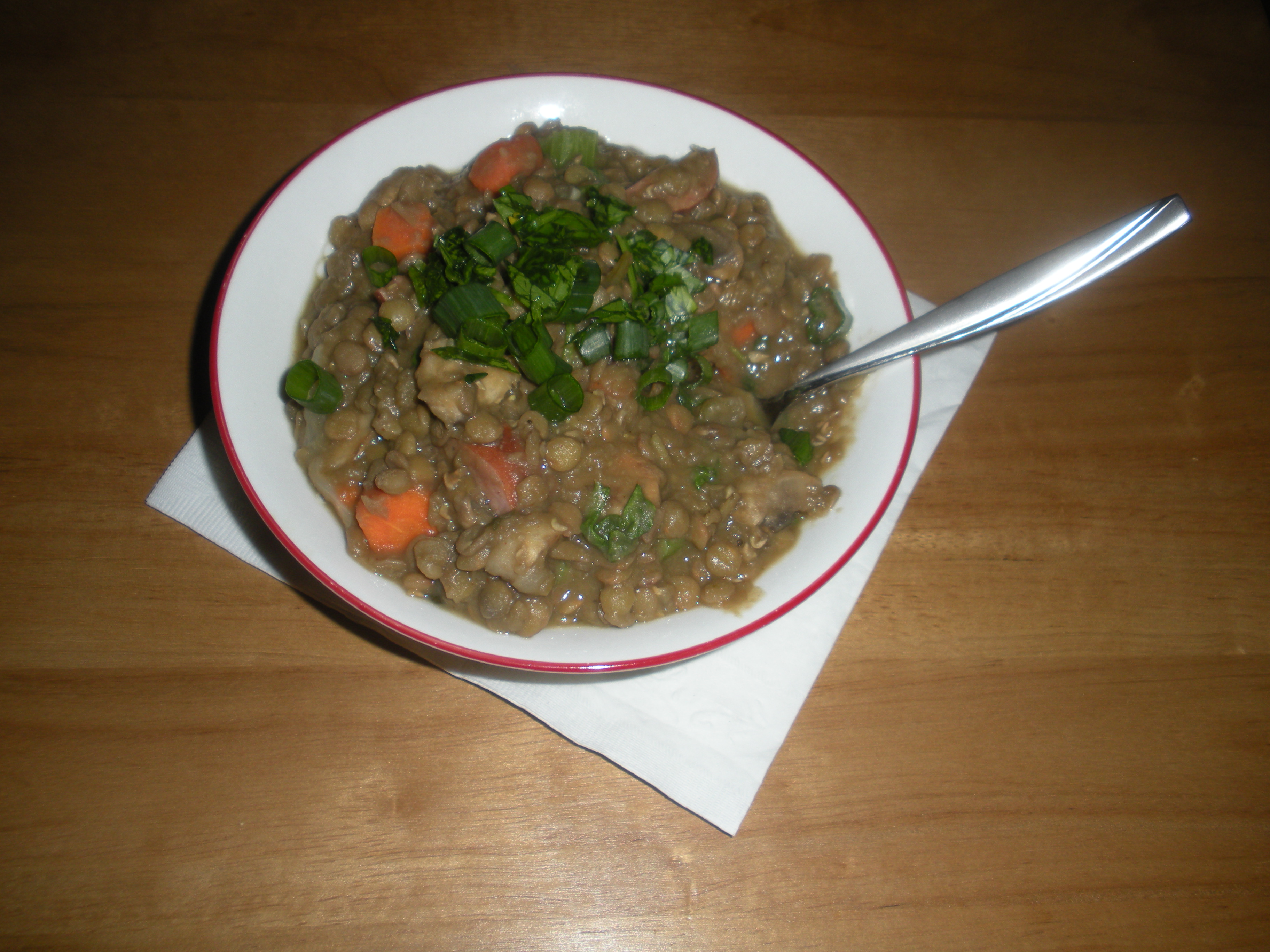 I have just finished looking through my archives and much to my amazement found that there are no entries for lentils. Lentils are so delicious and so good for you. They are packed with protein and fiber. They are easy to cook and require no pre-soaking. After rinsing and picking through the lentils, I simmered them in some water for about 20 minutes with cut up onion, celery, carrot and about an ounce of diced turkey sausage. I did that early in the day and later when I reheated the lentils, I added the rest of the turkey sausage (about 6 oz.), some more carrots and celery and a bunch of mushrooms. When the lentils were warmed through but the carrots and celery were still a little crunchy, dinner was served. We topped the whole thing with parsley and green onions. This dish is one of my comfort foods.