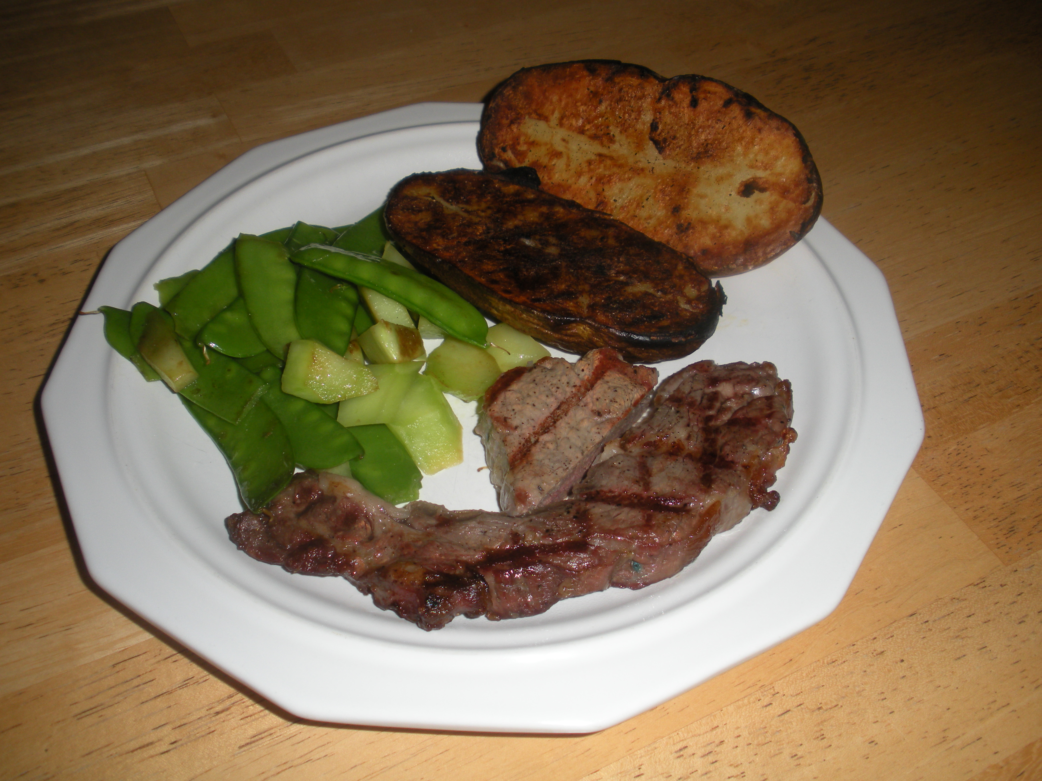 John and I have been exercising a lot! Sometimes we play tennis twice a day. Yesterday I did a combined three mile run and walk plus played tennis for an hour and a half in the afternoon. We are very hungry! So we decided we could have a little red meat. John trimmed it closely and grilled it. I microwaved two baking potatoes until they were almost done and then he finished them on the grill. I sauteed some pea pods (which I am always careful to string) with some leftover broccoli stems in a little butter. Except for wishing there was more meat, it was a fine dinner.