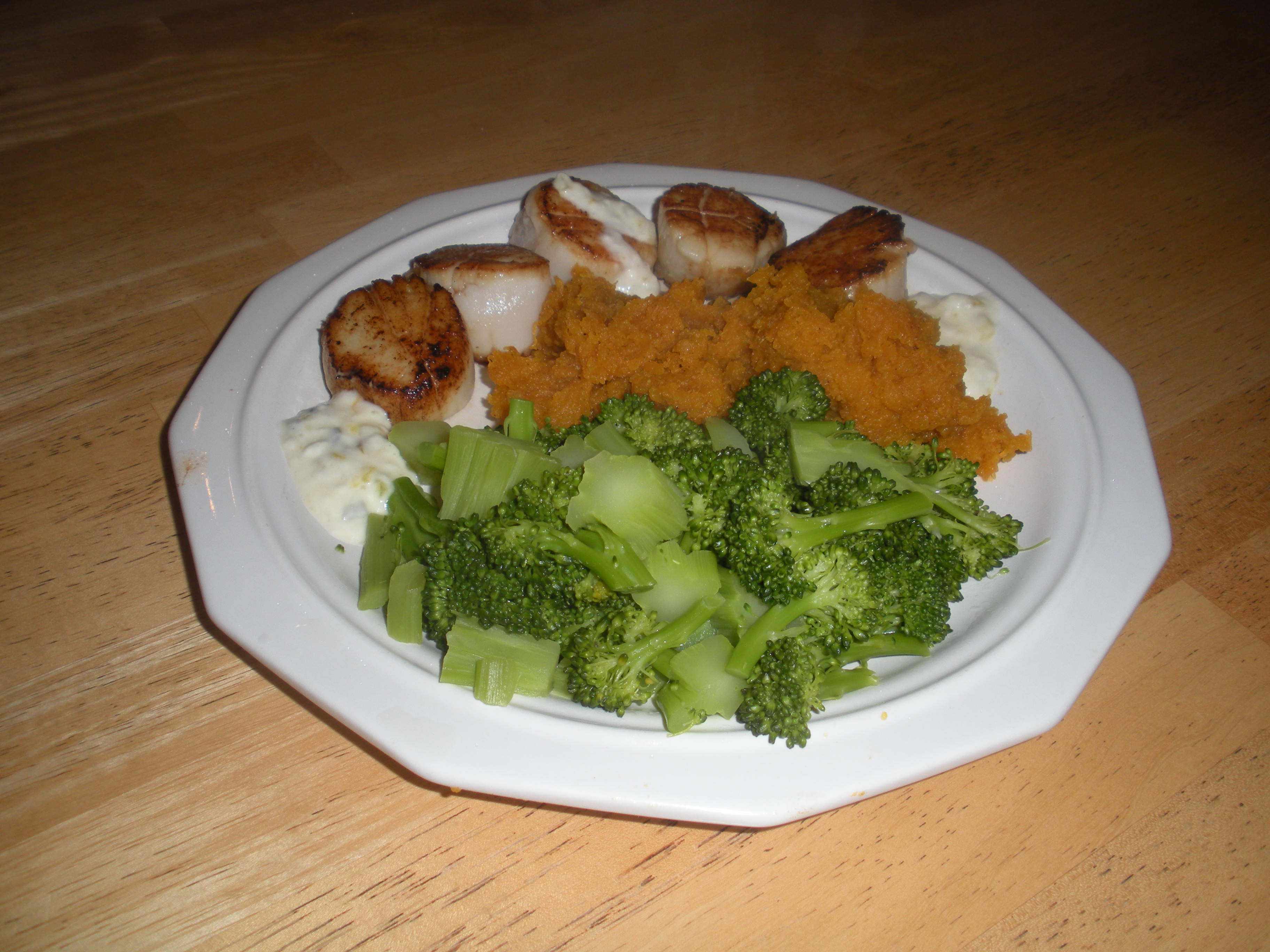 John quick seared the scallops. I made some broccoli and we had leftover chipotle/cinammon butternut squash. I made some tartar sauce. Perfect.