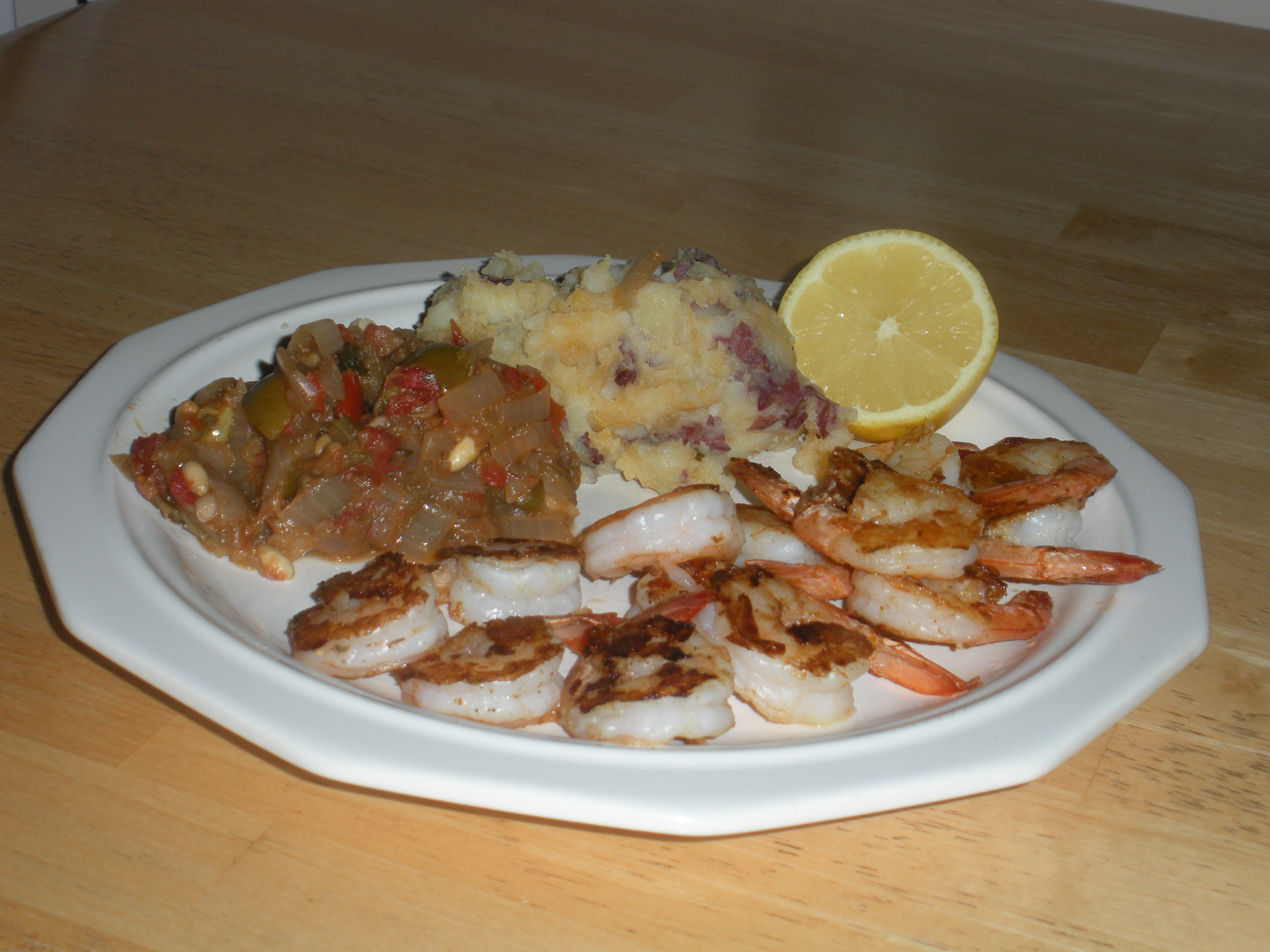 This dinner was made during our eat down phase. John is a master of making perfectly cooked shrimp. I combined some leftover rutabagas with some steamed new potatoes. The caponata was made from roasted eggplant, olives, onions, peppers, pinenuts, capers, raisins, some olive oil and spices. I made enough of this to take to the parties we were going to as well as have some for a side dish.