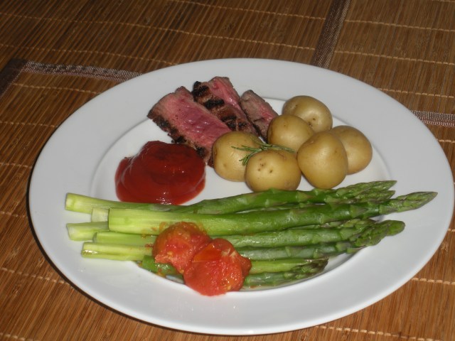 Last night we went out to dinner. Dining out is a rare occurrence around here. It is just too difficult to eat correctly when dining out. So back to the straight and narrow today. Unusually, though, we had beef. We have a bagful of 6 to 7 oz. pieces of flank steak in the freezer. It is not a high fat piece of beef and as long as I don’t eat too much of it, I’m okay. So tonight’s dinner was 1 1/2 ounces of flank steak, steamed new potatoes and asparagus. Also a couple of steamed tomatoes. The asparagus at our local store is from Mexico and is really tasty and fairly low-priced. I think we will be eating a lot of asparagus since the season is lengthened by being able to buy it from Mexico followed by the great local California supply.