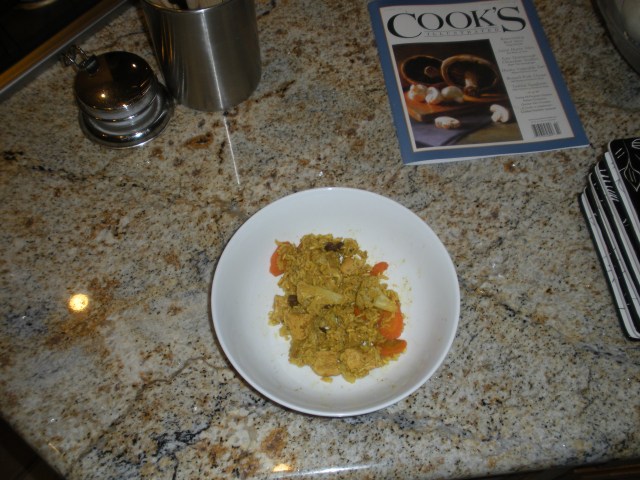 Since it was Chicken Monday yesterday, of course we had chicken. We decided to make it a little more exciting than usual. Since we were not going to have a lot of preparation time, we used pre-cooked chicken strips. John toasted the curry mixture and sauteed the onions. We added some carrots and cauliflower plus a handful of raisins. Then we added brown rice, the chicken pieces and boiling chicken stock. We covered it tightly and popped it in the oven for an hour. Since I love eating this, I didn’t manage to take a picture until I was part way done.