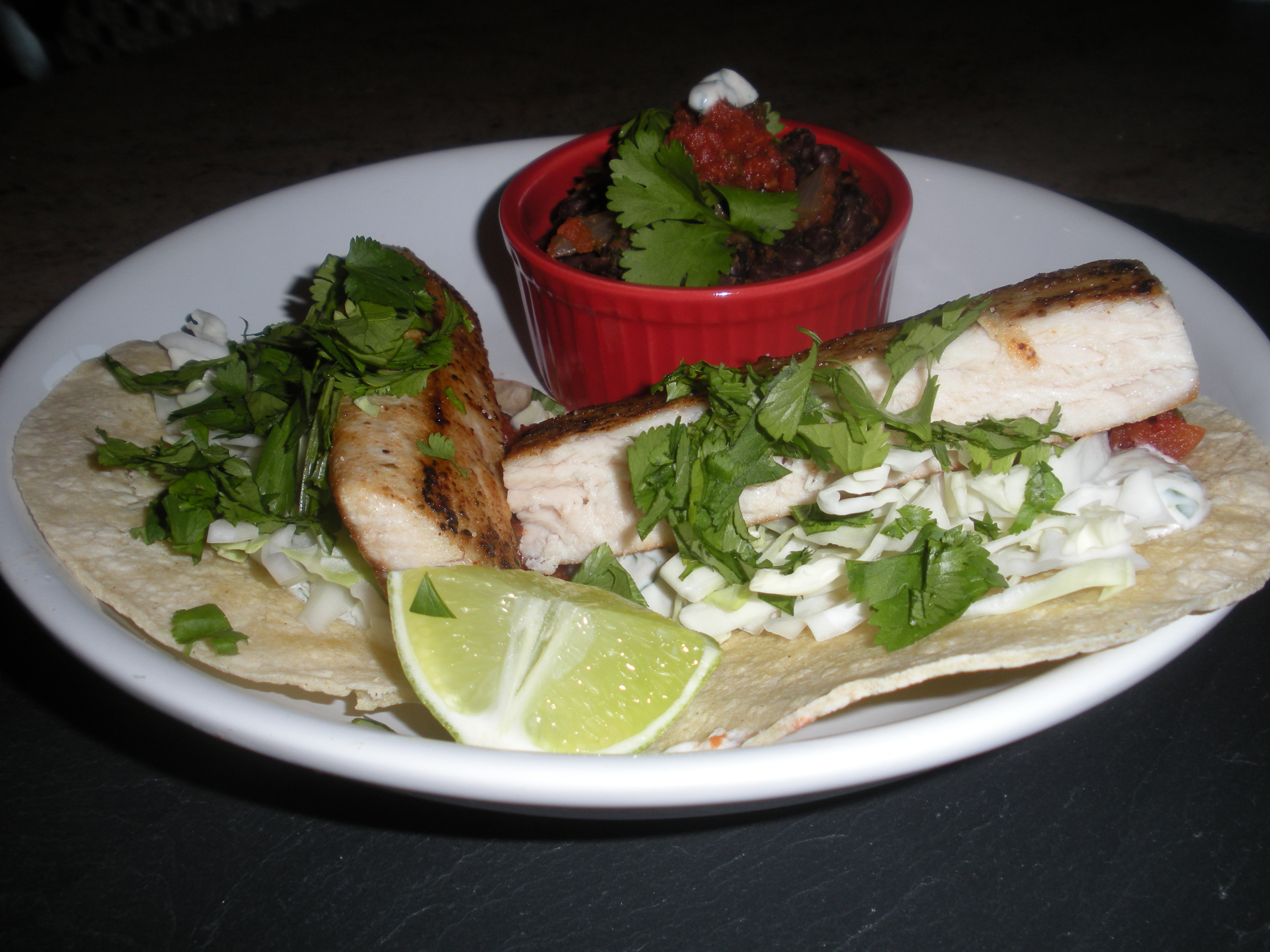 We bought some frozen ono at Costco and made fish tacos. Of our various experiments with types of fish, ono has come out on top. It is a firm white fish with a mild sweet flavor. The fish was served in corn tortillas with cabbage, crema (with yogurt as a base), salsa (Jack’s from Costco is our favorite), and cilantro. I doctored up some black beans to go along with the tacos. This is a dinner that totally does not feel like “diet” fare.