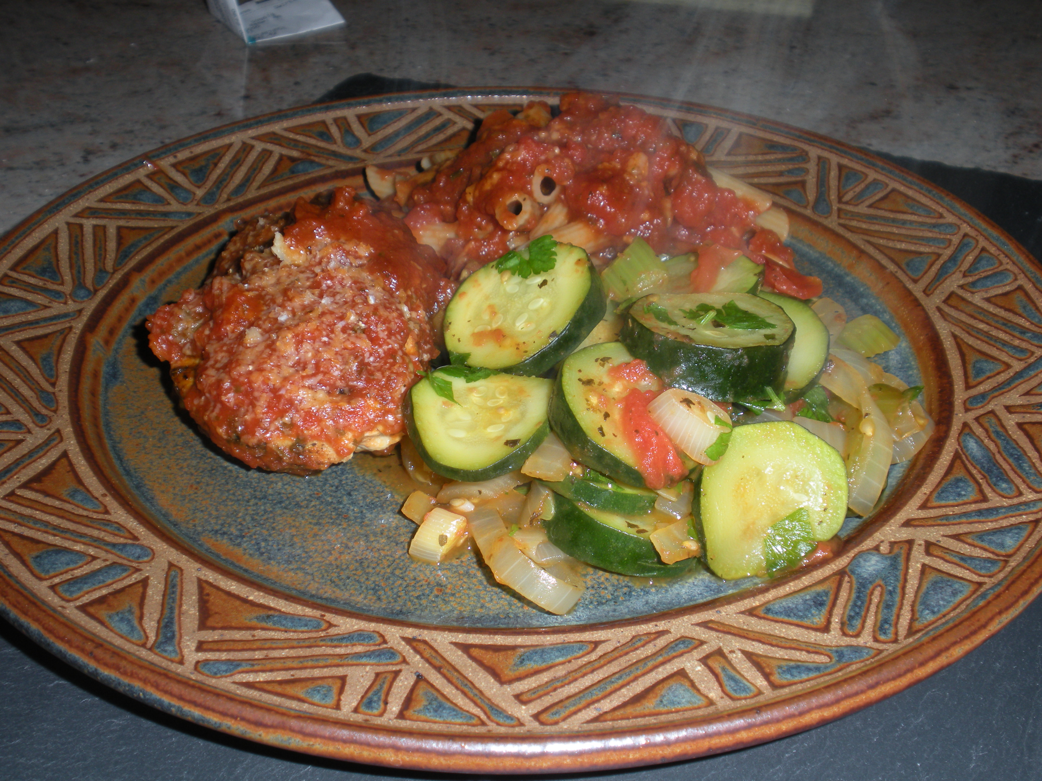 This week’s Chicken Monday had an Italian flavor. John browned two small chicken breasts and then finished them in the oven with some spaghetti sauce and a little parmesan cheese. In the meantime, I boiled up some whole wheat penne and sauteed zucchini with onions, celery and fresh tomatoes. Of course, the sauce was low fat and the vegetables were sauteed in olive oil cooking spray. It was a nice change on a Monday from chicken with either butternut squash or rutabagas and broccoli.