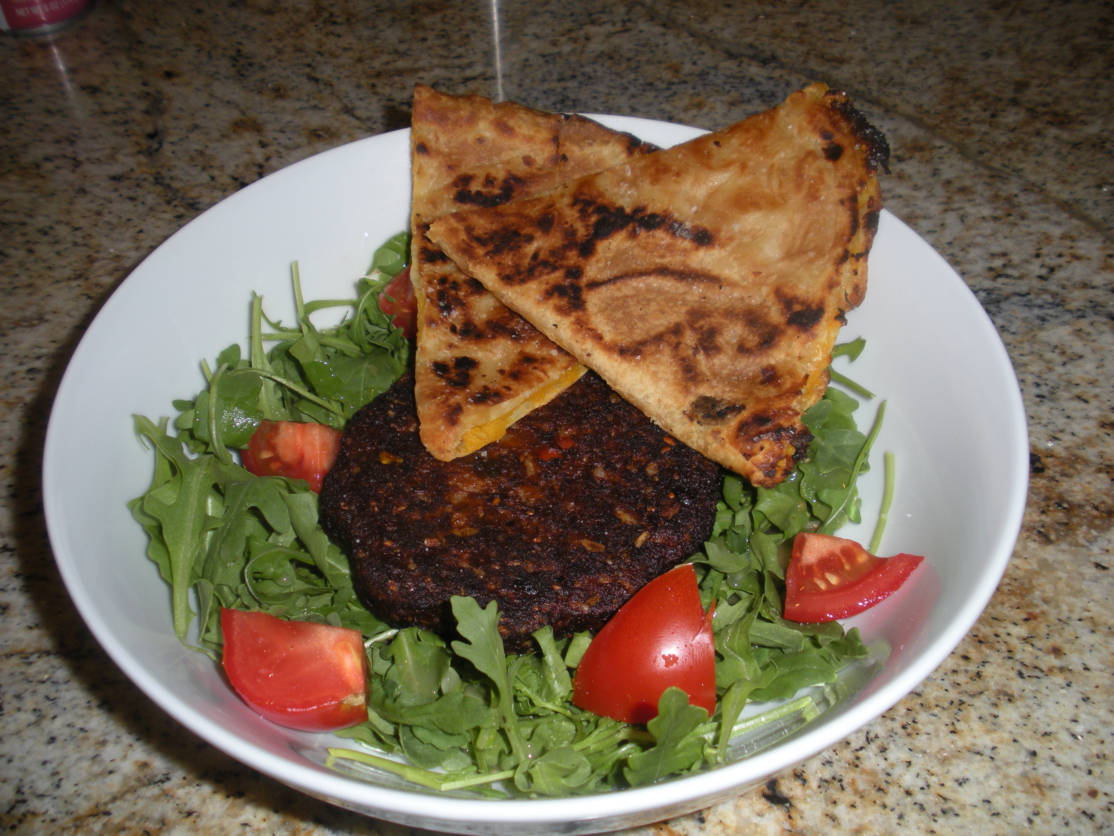 Thursday I needed something easy and low calorie for dinner. These days my go-to dinner when I need to eat with no fuss I choose chipotle bean burgers from the freezer. Tasty and nutritious, the burgers can be ready in two minutes. I also warmed up a piece of sweet potato bolani. Bolani is a stuffed Afghan bread. A large hunk of the sweet potato one has less than 100 calories. They had several different samples to try at Costco and they were all very tasty. Under my bean burger and bolani I had an arugula salad with fat-free dressing. My whole dinner was satisfying and prepared in less than 5 minutes.