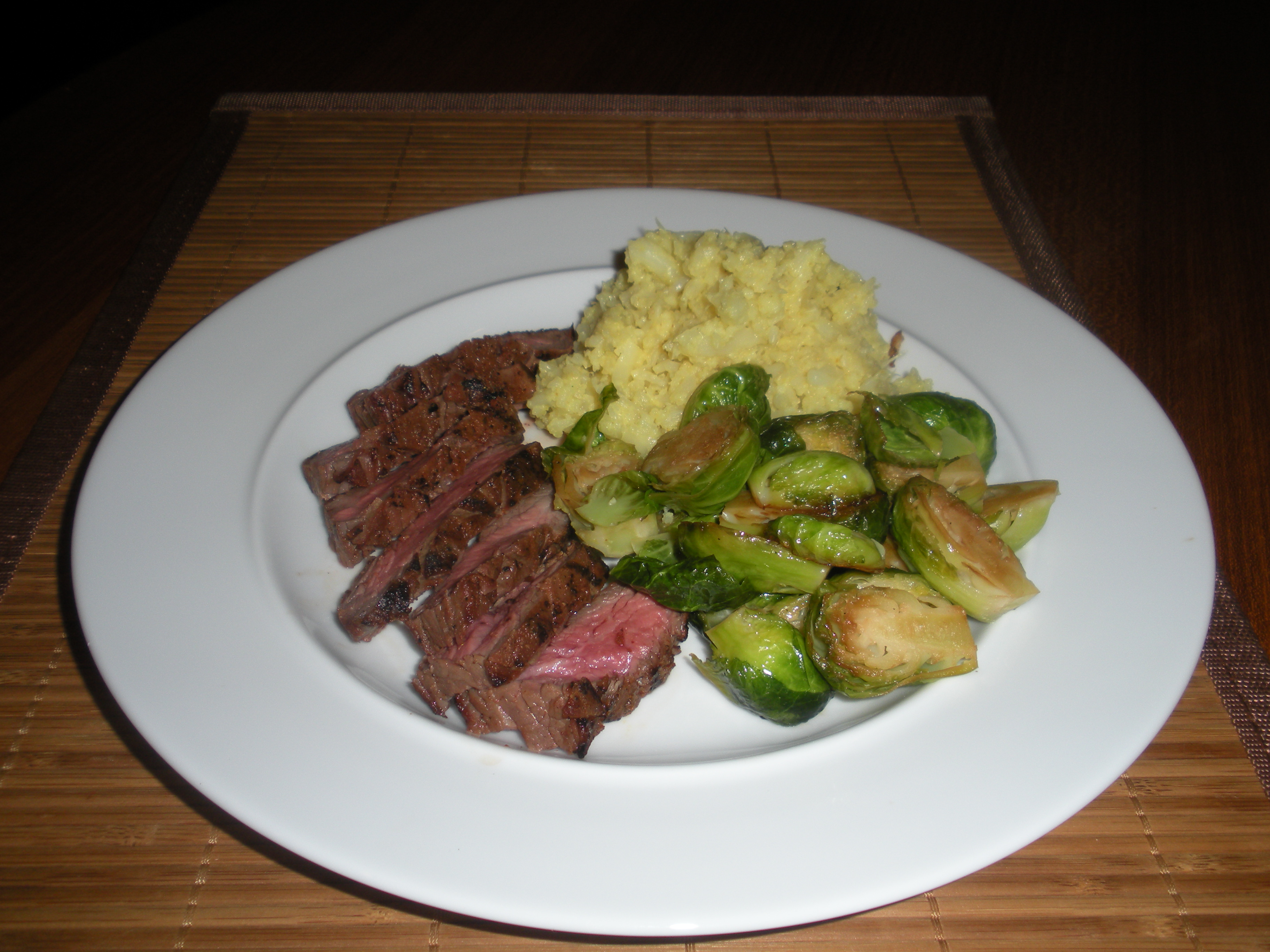 Along with the flank steak I made my usual Incredibly Yummy Brussels Sprouts and steamed some cauliflower. Much like rutabagas, mashed cauliflower gives one the impression that you are having a starch when you are not. We toasted some curry spices and mixed that in for more flavor. I think we will be making this dinner more often!