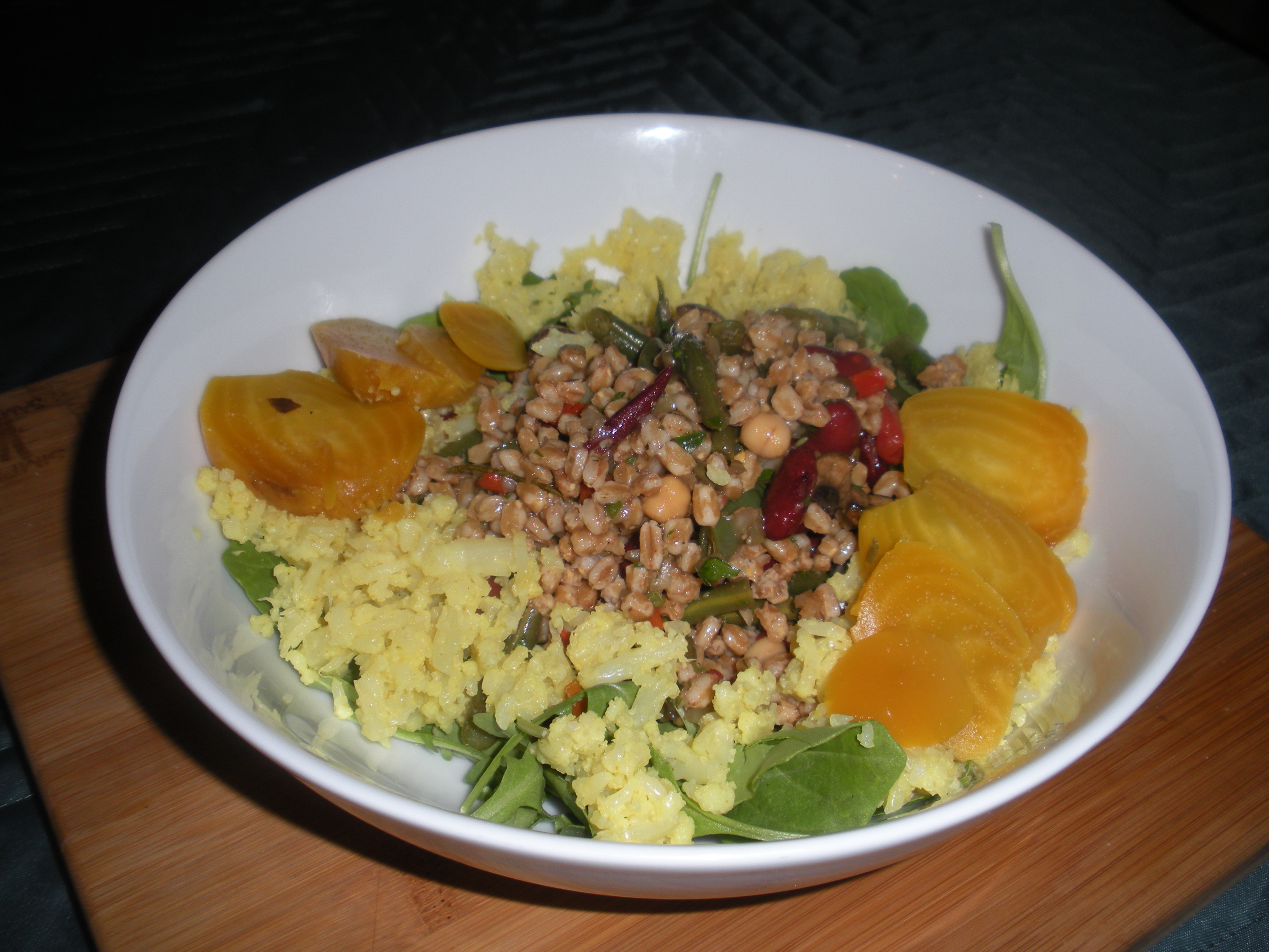 Monday came and went. And there was no chicken. Gasp! Actually I did have a chicken sandwich for lunch so maybe that counts. Anyway, we had a ton of leftovers from Mother’s Day. I did give away the cookies and John ate the last pretzel roll for breakfast. So our leftovers were of the healthy sort. I made a gimish of the leftovers. Arugula in the bottom of the bowl. On top, a mixture of farro salad and three bean salad. Around the edges, curried cauliflower and roasted beets. It was not really an acceptable Chicken Monday dinner but it was fast, healthy and tasty.