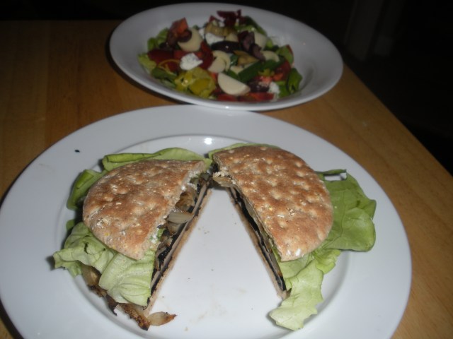 This week has been all about convenience. Tonight for dinner we had the leftover hamburger and portobello mushroom from Mother’s Day. I love portobello mushrooms as burgers. They are really tasty grilled and I serve them with a little goat cheese spread on the sandwich thin, some sauteed onions and lettuce. We also had a salad. Dinner done.