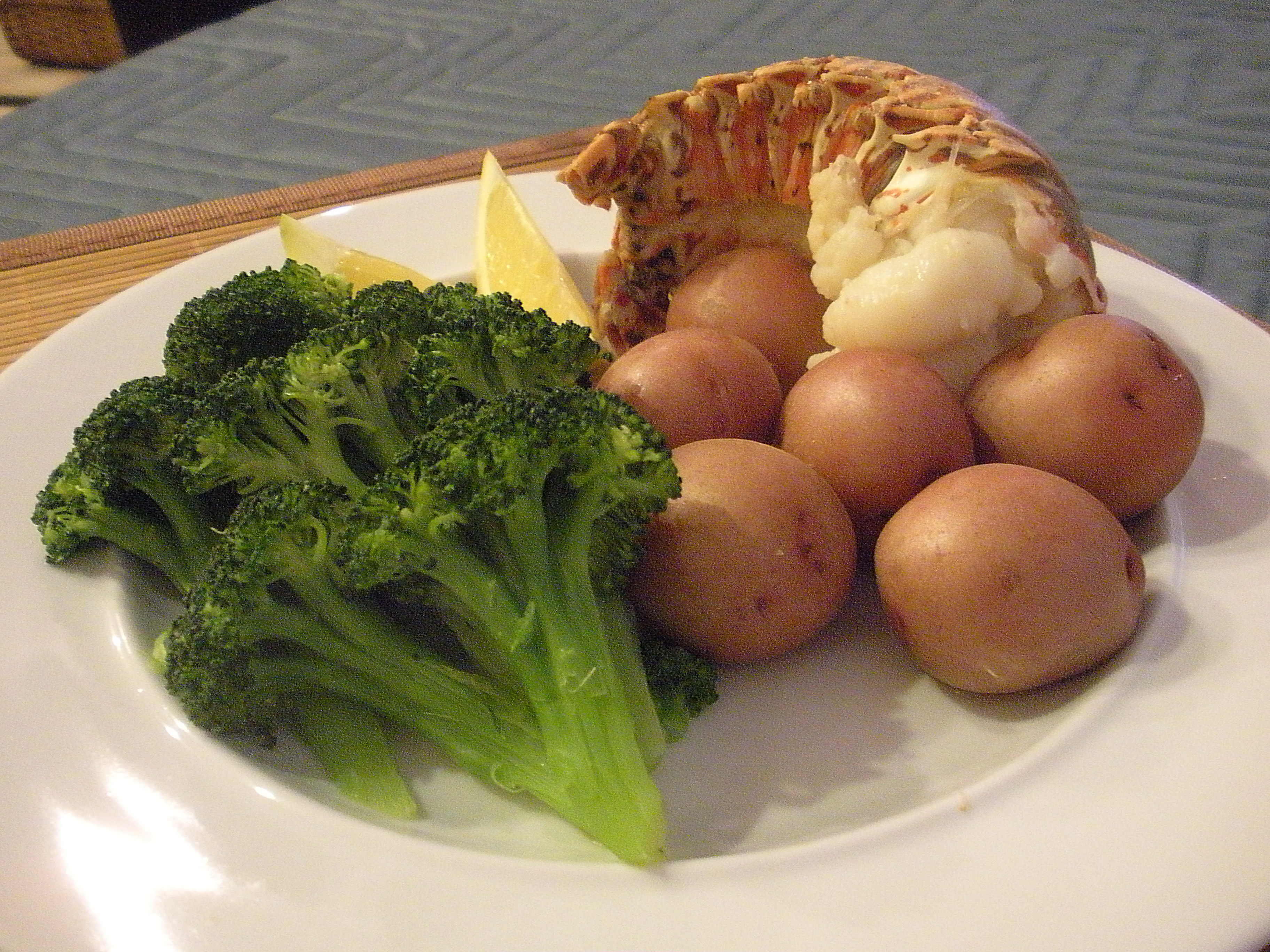 So John steamed the lobster tails and I made new potatoes again because they were so good last night. I also cooked some broccoli. We had a nice bottle of wine. Monday is a good day for celebrating.