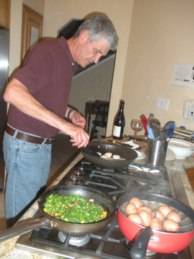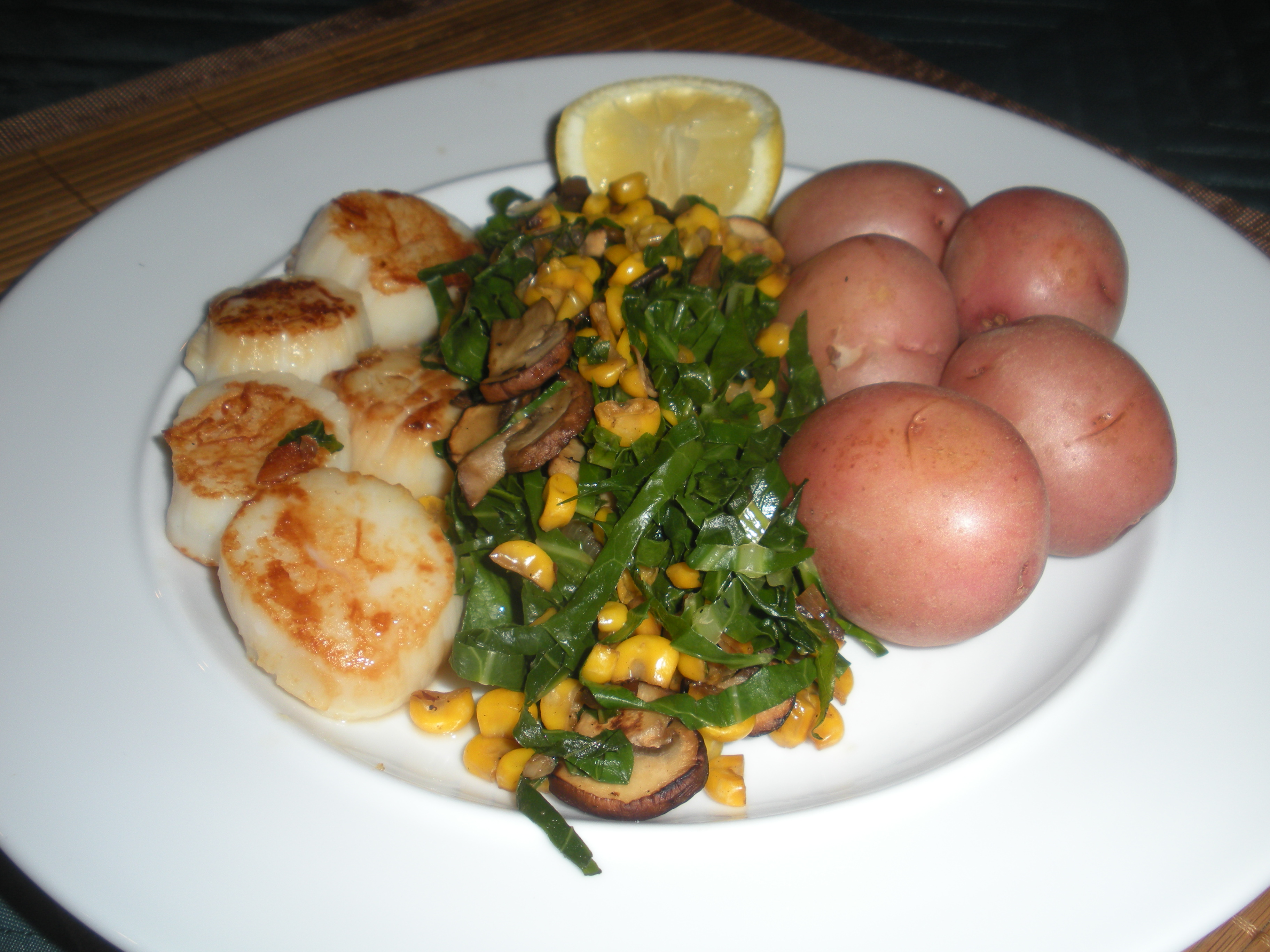 While he was searing the scallops, I steamed some new potatoes. They turned out really well due to the potatoes themselves being really tasty. I also chiffonade some collard greens and sauteed them with mushrooms and corn. When you cut the collard greens into little pieces, they take no time at all to cook.