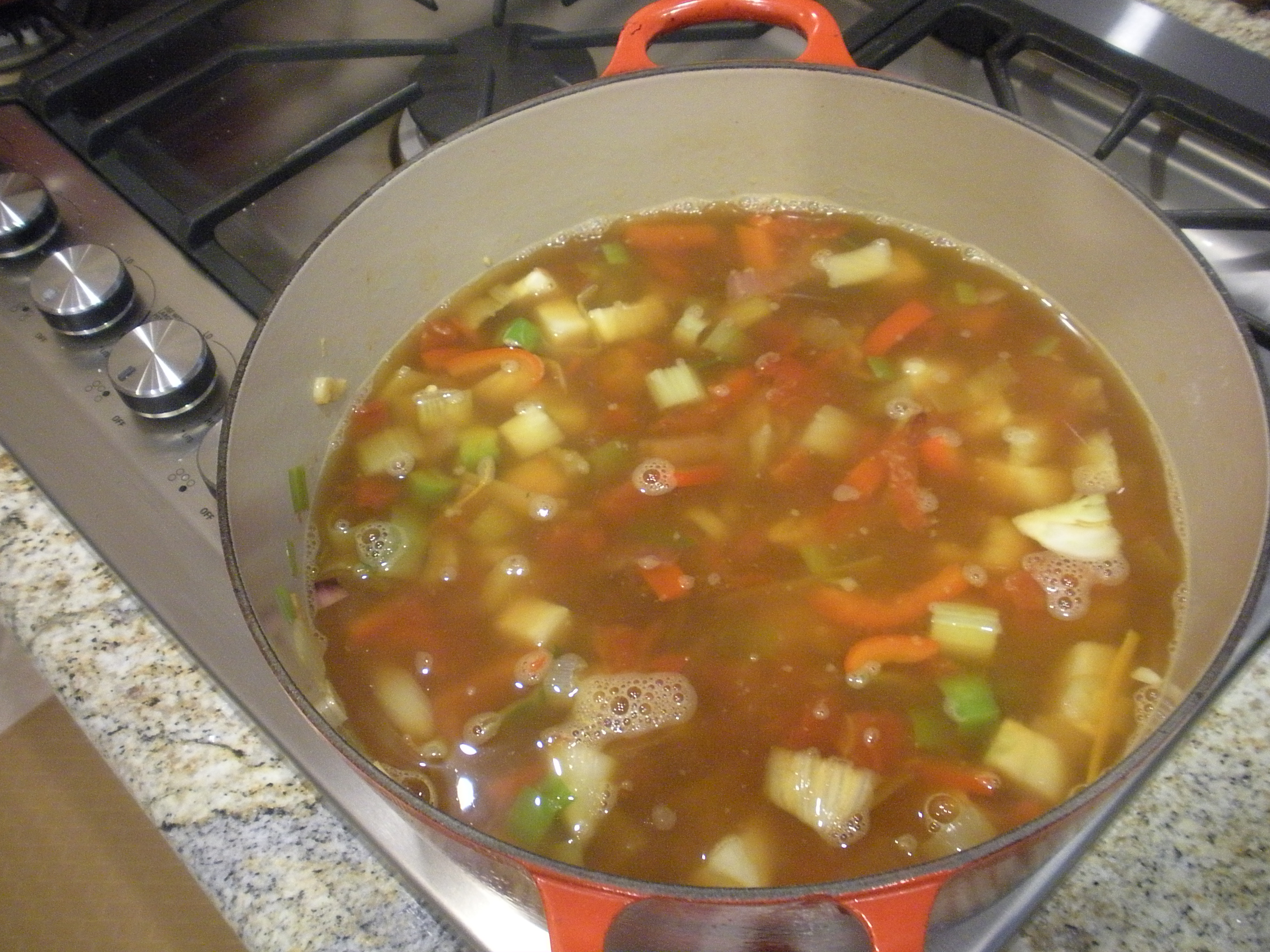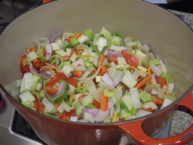We have not made this dinner in a long time, probably five years or more. The Mediterranean fish soup is adapted from a recipe by Rick Stein. We used what fish and shellfish we had in the freezer – scallops, shrimp and ono. John always saves all the shells from our lobster and shrimp meals and had made a fish stock that was also in the freezer. While he prepared the seafood, I was in charge of cutting up a massive amount of vegetables. (I love to cut stuff up!)