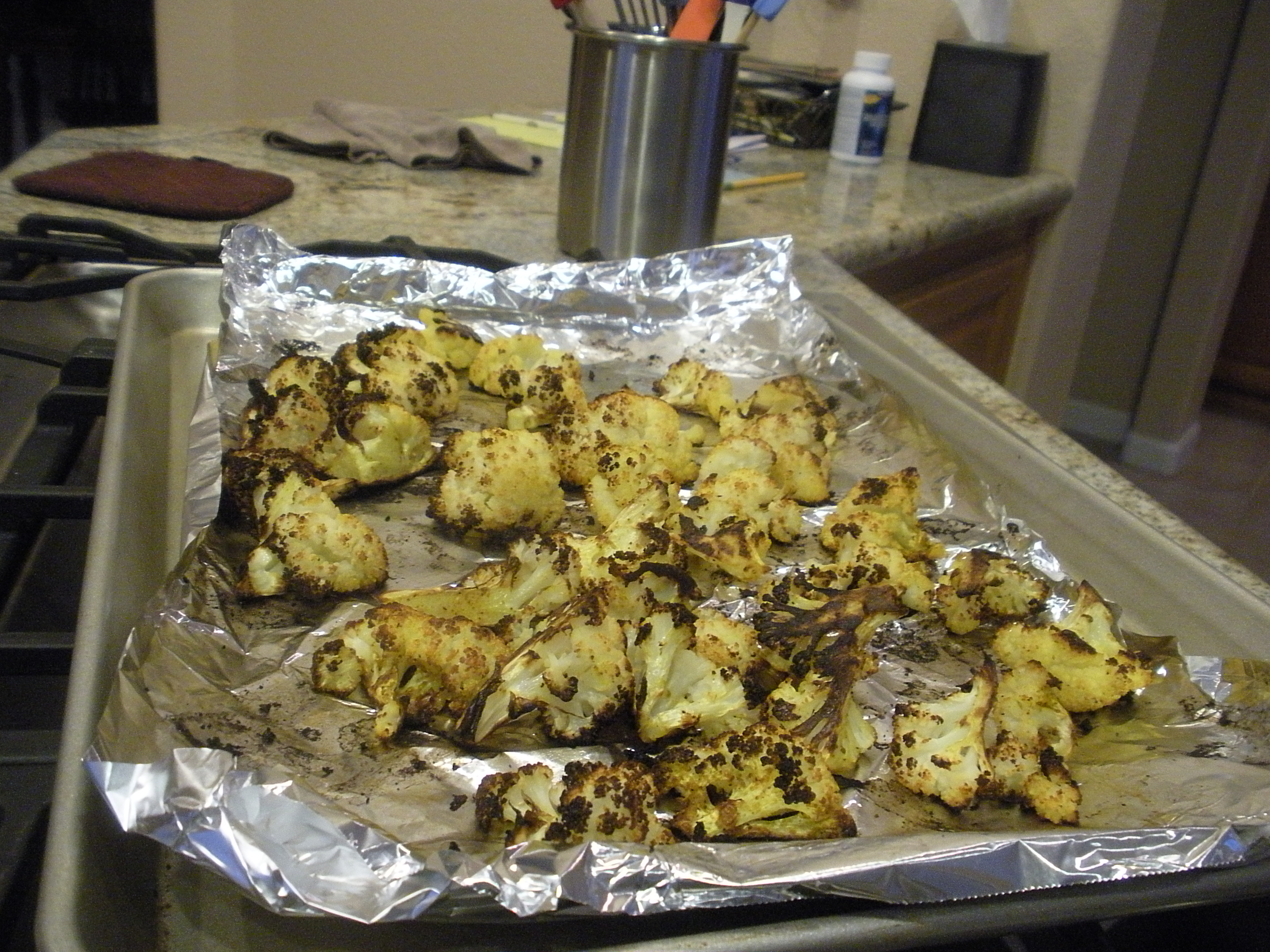 On Wednesday, John worked and I spent the day with Sarah who was sewing frantically trying to finish up her Ice Queen costume for Fanime this past weekend. So by the time we got home after the commute, we wanted something quick and easy. Chipotle bean burgers by Morningstar are ready in two minutes. In addition, I cut up a head of cauliflower that needed using, shook the florets in a plastic bag with two teaspoons of olive oil and some salt, and popped them in the oven which was set at 500 degrees convect. In fifteen minutes we had delicious roasted cauliflower.