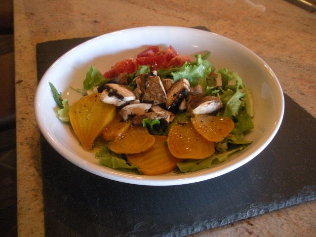 Salad with roasted golden beets, tomatoes, mushrooms and green onions