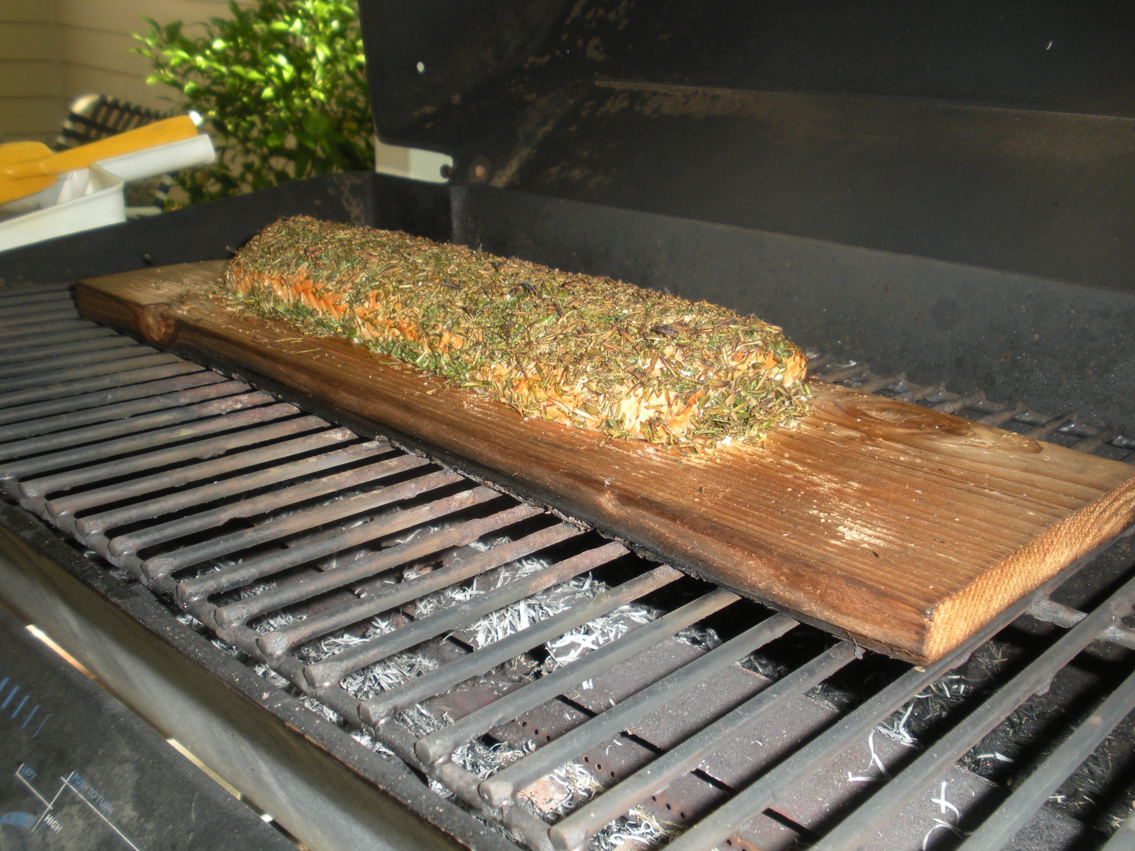 Then he put it on the grill adding rosemary to the fire for flavor. It cooked for around 12 minutes.
