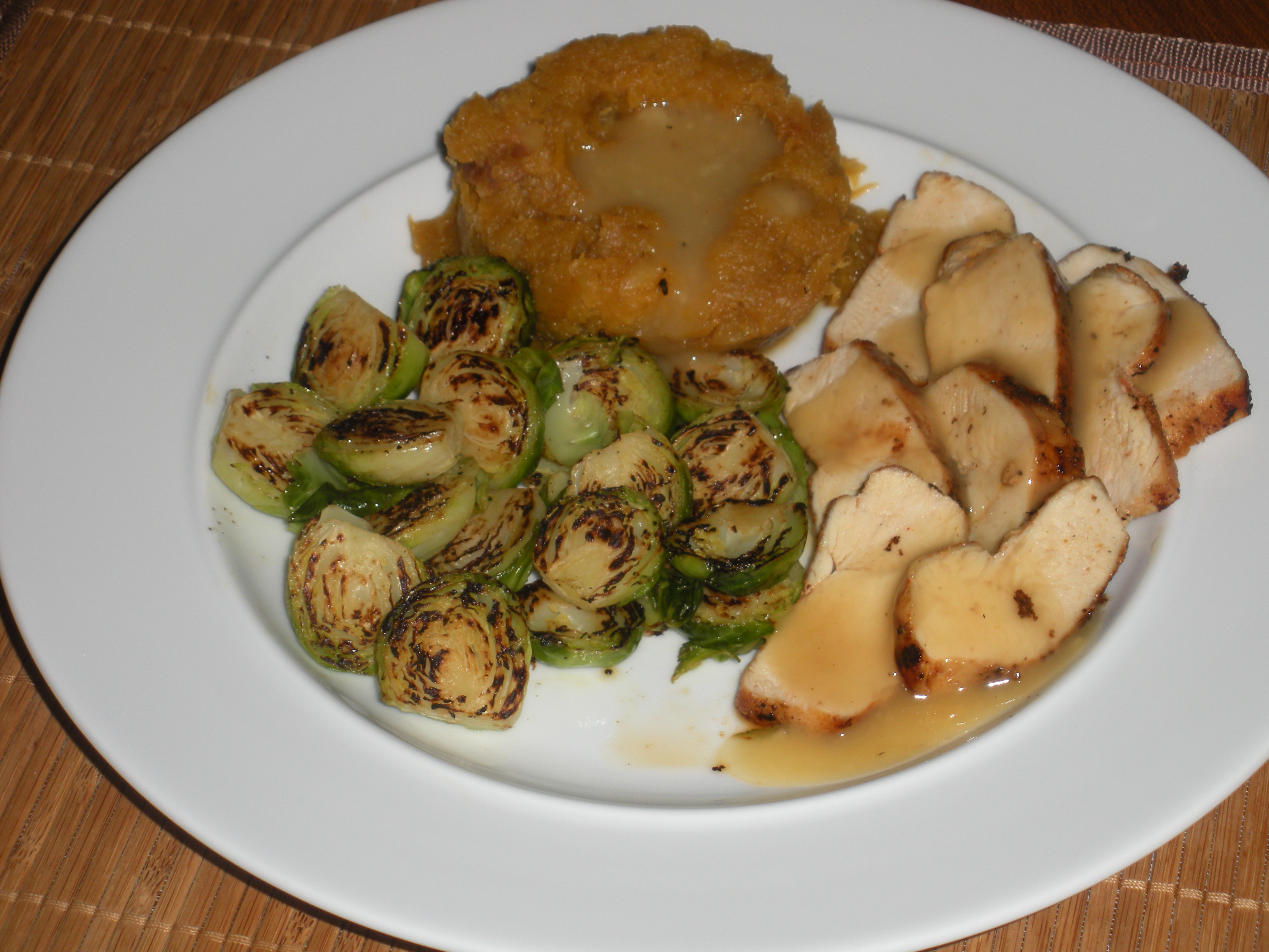 This was Chicken Monday delayed until Thursday. John made his usual great pan roasted chicken. We added the pan juices to a packet of chicken gravy. The Brussels sprouts although a little oddly shaped were quite delicious made with a teaspoon of butter and sherry to finish them off and make them brown. The butternut squash turned out to be one of those watery, bland tasting ones. I added soy sauce, instant coffee, honey, plenty of salt and finally chipotle powder to make the squash more palatable. With the gravy on it, the enhanced squash was eatable.