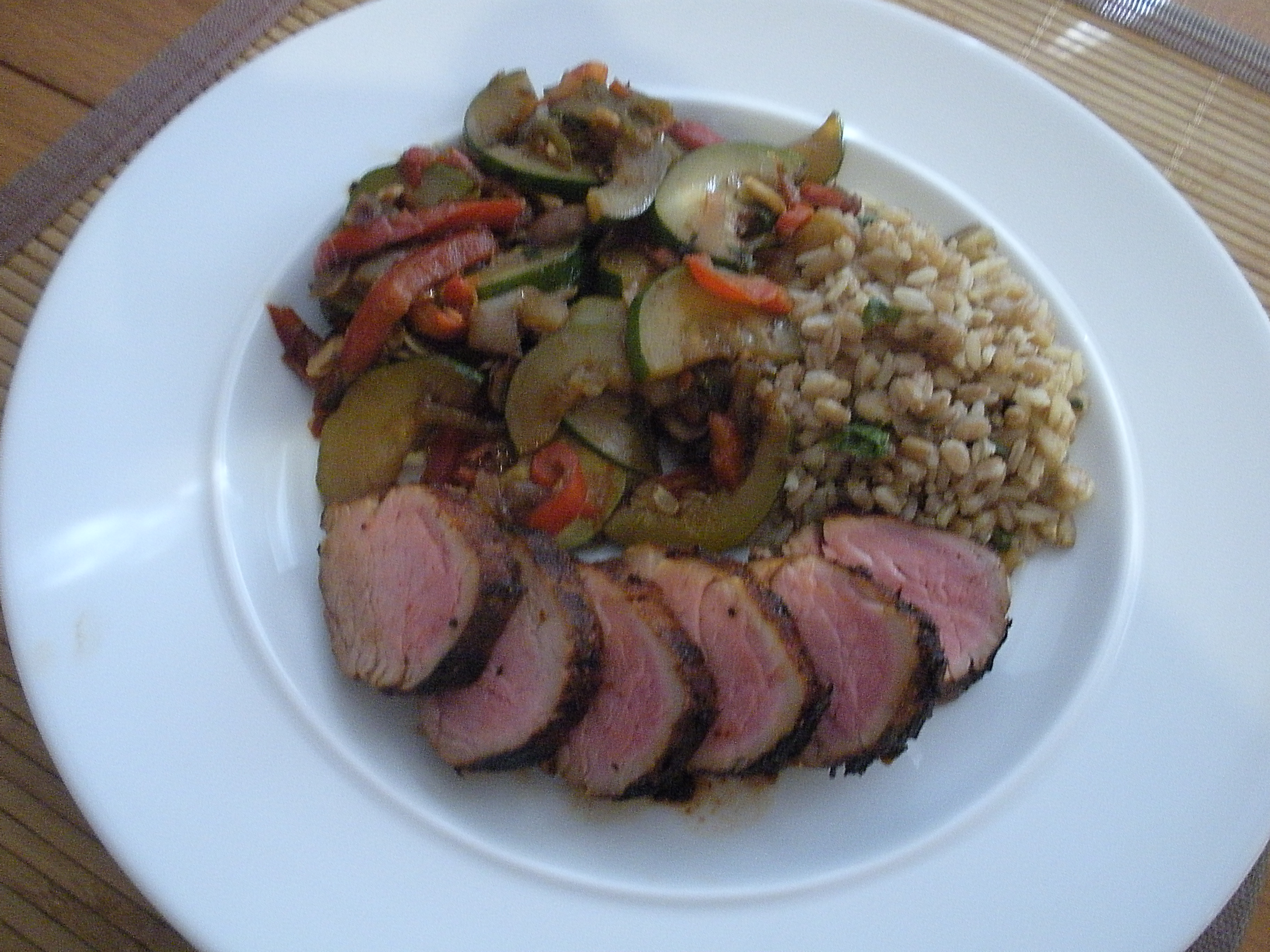 Saturday night’s dinner consisted of a pan roasted pork tenderloin rubbed with ancho chiles, salt, pepper, garlic powder and oregano. John used the spice grinder to turn the ancho chile into a powder. The pork turned out really well, rosy pink with some spice. I reheated the leftover farro and brown rice mixture from last night. I also made a medley of zucchini, mushrooms, red bell pepper, onions and serrano chiles using a teaspoon of oil in the saute.