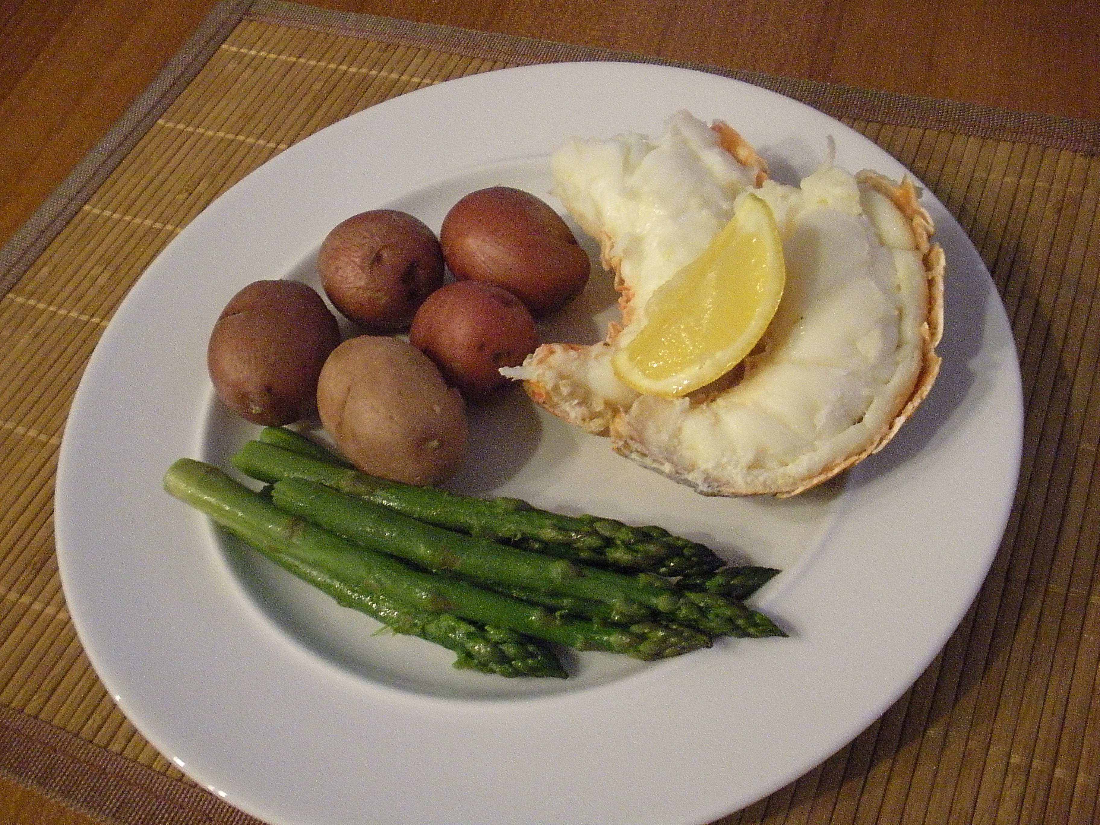 When I was relating to Jon what our dinner would be for Saturday night, he laughed and called it first world dieting. He has a point. This is a favorite diet dinner but seriously how many people can afford to diet on lobster tails? It cost about $20 for the lobster tails and maybe $2 for the rest of the components. How much would it have cost for us to go out for a way inferior meal? Probably a lot more including tax and tip. Sometimes it is a better strategy to cook luxe rather than dine out poorly.