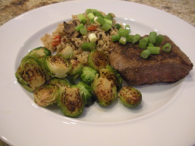 For dinner tonight we had lean bison steaks, brown rice with asparagus and Brussels sprouts. It was a tasty and satisfying meal.