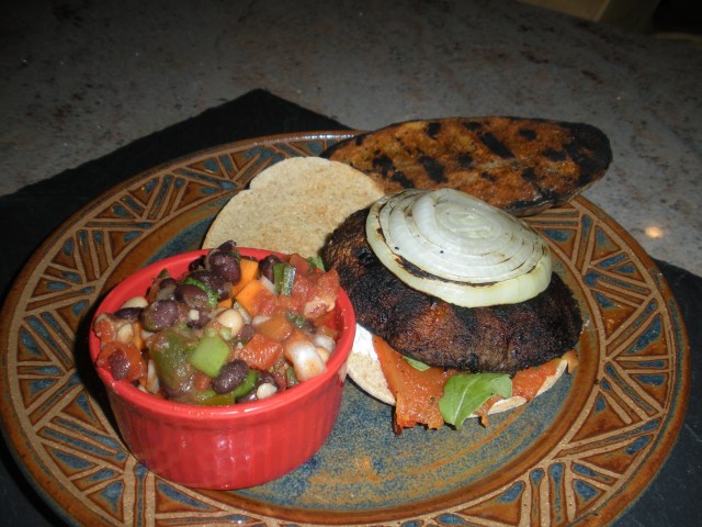 We grilled some portobello mushrooms and served them on a sandwich thin with 1/2 ounce of goat cheese, a slab of grilled onion, roasted red pepper and arugula. I made Texas caviar which is a spicy bean and vegetable salad and we split a grilled baking potato.