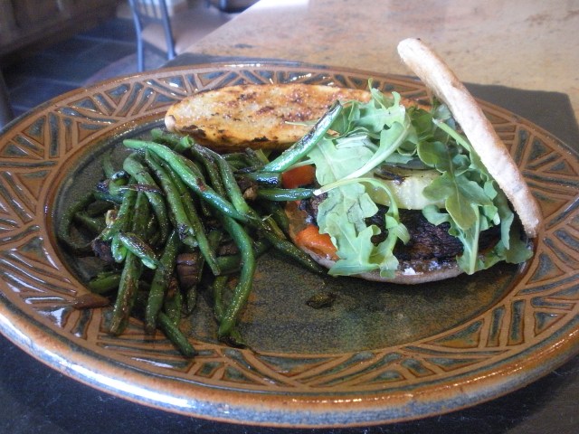 Having secured our wine supply yesterday, we were well set for Pioneer Day. We also had two left over portobello mushrooms from last week that needed eating. Costco is an excellent source for them. They are much cheaper than in the grocery store but you have to buy them four at a time. So, marinate and grill the mushrooms. Microwave and grill the split potato. Saute some green beans with the leftover bits and pieces of mushroom and green onion. The portobello was served on a sandwich thin with 1/2 oz. of goat cheese, a roasted red pepper, grilled onion and arugula.