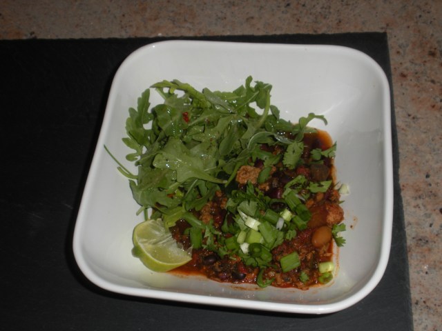 When dinner time came, dinner was ready for us. We tweaked the seasoning and served the chili with an arugula salad.