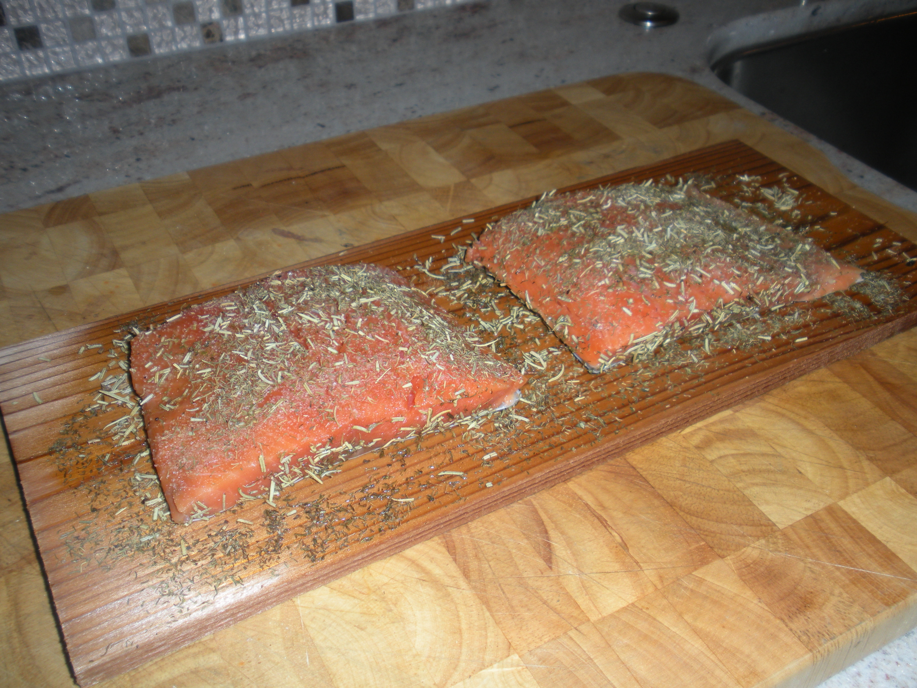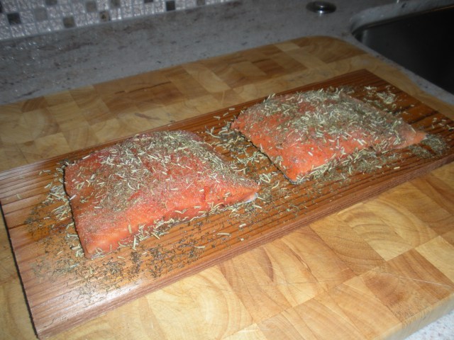 John found some cedar planks at the grocery store and also wild salmon which was frozen but looked pretty good. Here’s the salmon ready to go on the grill.