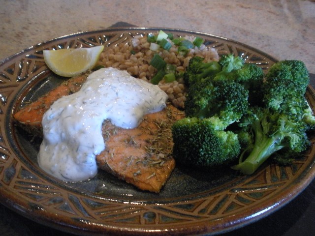 I had started some farro about an hour before using the brown rice oven method (America’s Test Kitchen) which works just as well for farro as it does for brown rice. The hardest part of making the rice or farro this way is to remember to start it an hour or so before you want to serve dinner. The broccoli was simply cooked in a little water and served with a squirt of faux butter. I also prepared a yogurt dill sauce.
