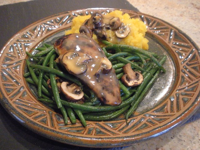 A typical Chicken Monday dinner. I set my eensy chicken breast on a nest of green beans and mushrooms. Having the gravy always makes this dinner better. Rutabagas, eats like a starch, counts like a vegetable.