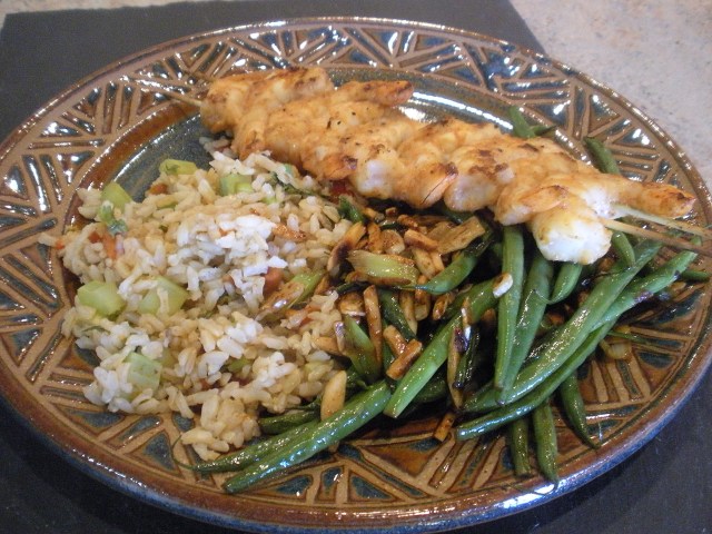 John marinated and spice rubbed the shrimp with sherry, garlic, Old Bay, chipotle powder and ginger. He put them on two skewers so they wouldn’t twirl around and cooked them on the grill. I added cilantro, chipotle powder, garlic, lime zest, lime juice, roasted red pepper and celery to our leftover brown rice. I cooked the green beans in a little water, soy sauce and a couple of drops of sesame oil. When they were cooked through I added sauteed sliced garlic and slivered almonds that I had prepared earlier.