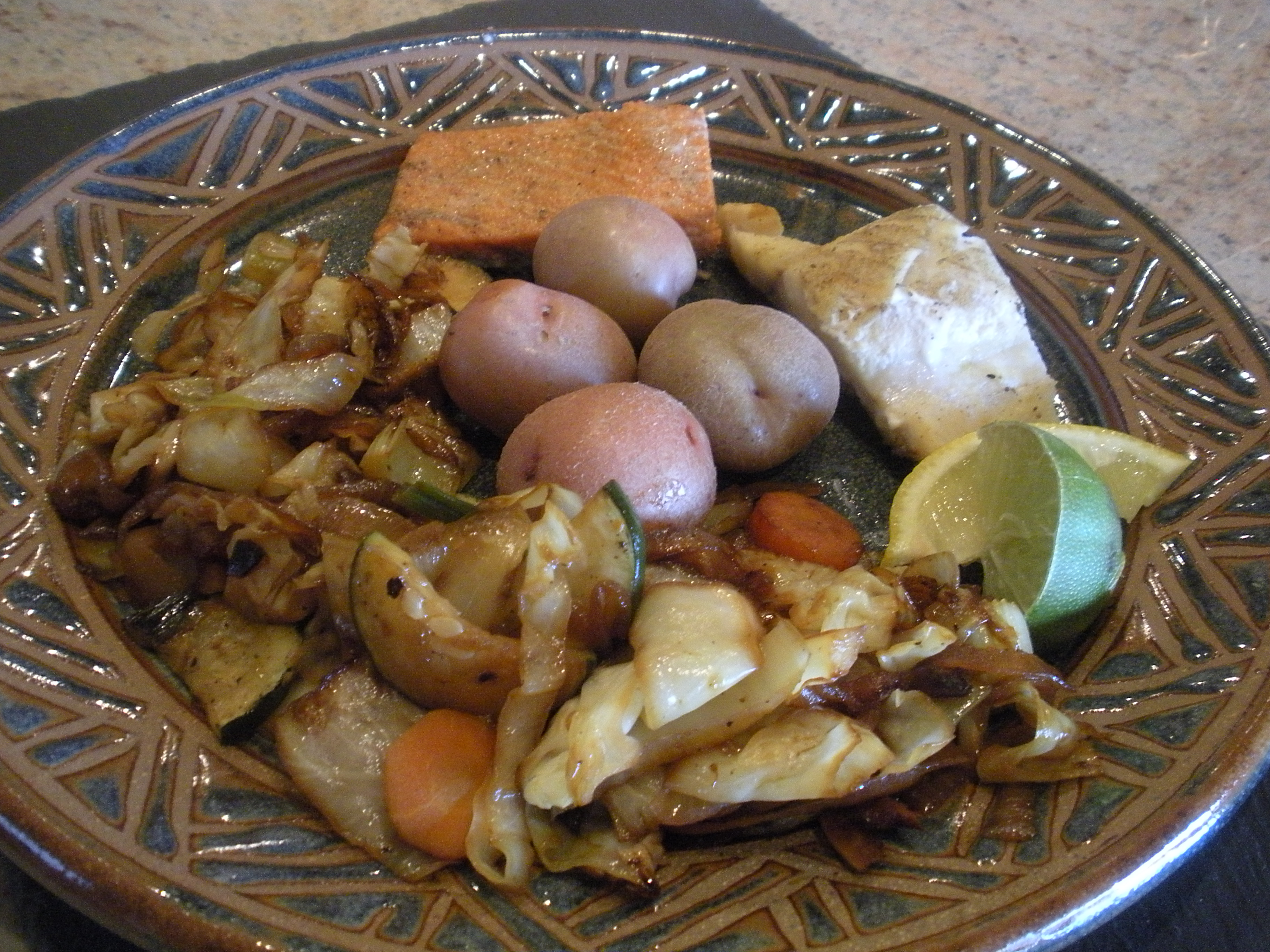 We had some extra cod and salmon that we didn’t use in the Mediterranean soup so John put them on the cedar plank and grilled them outside. Since we are going home on Saturday my job was to find a way to incorporate all the vegetables we have left into some sort of cohesive dish. We had nine little potatoes so I steamed them. The other vegetable turned out to be kind of melange of cabbage, carrots, celery, zucchini and onion with Thai seasoning. I used a little sugar, the juice of a lime, some soy sauce since I didn’t have any fish sauce and sesame oil. Was it successful? John liked it but of course he likes everything. I thought the cabbage was a little weird in it but it didn’t stop me from eating my half of the dish.