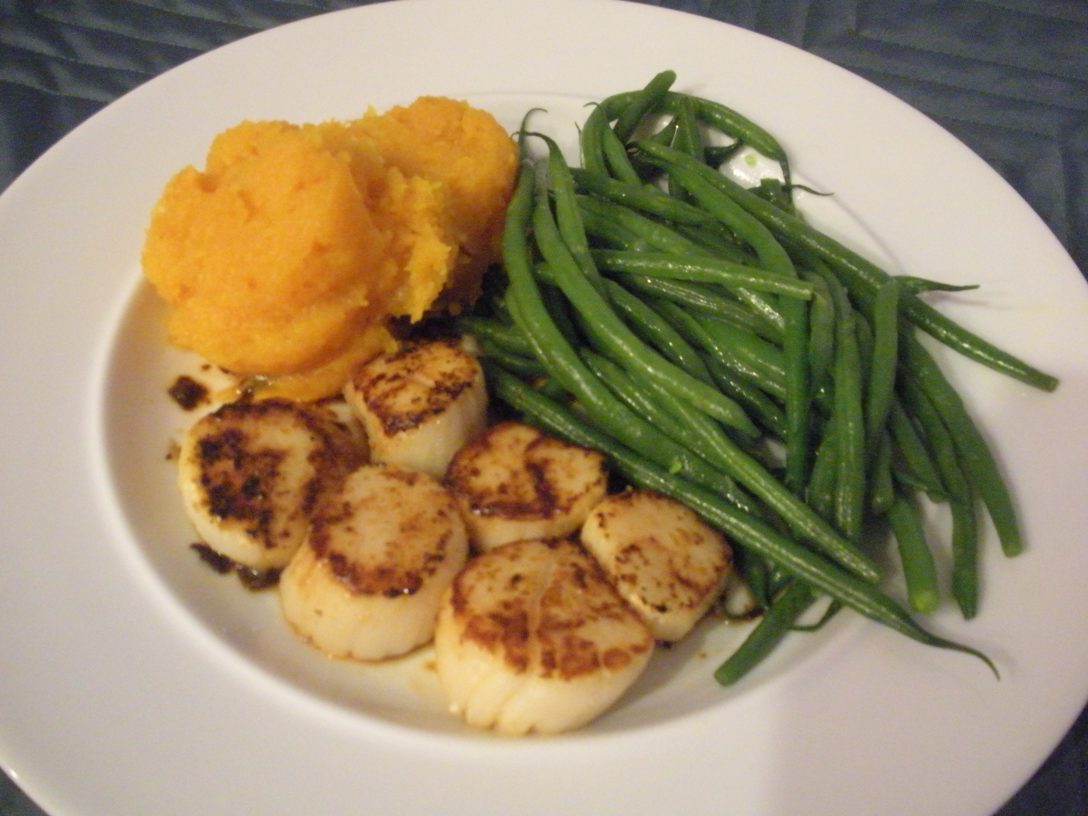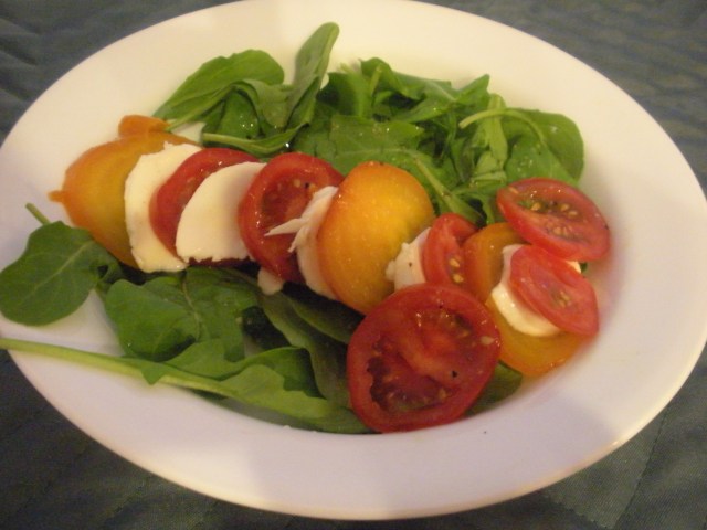 This dinner made such an attractive plate. John made a pan sauce for his scallops and I made a little low fat tartar sauce. At the same time as I was roasting the butternut squash, I also roasted some golden beets and our first course was a lovely salad of arugula, roasted beets, fresh mozzarella and tomatoes.