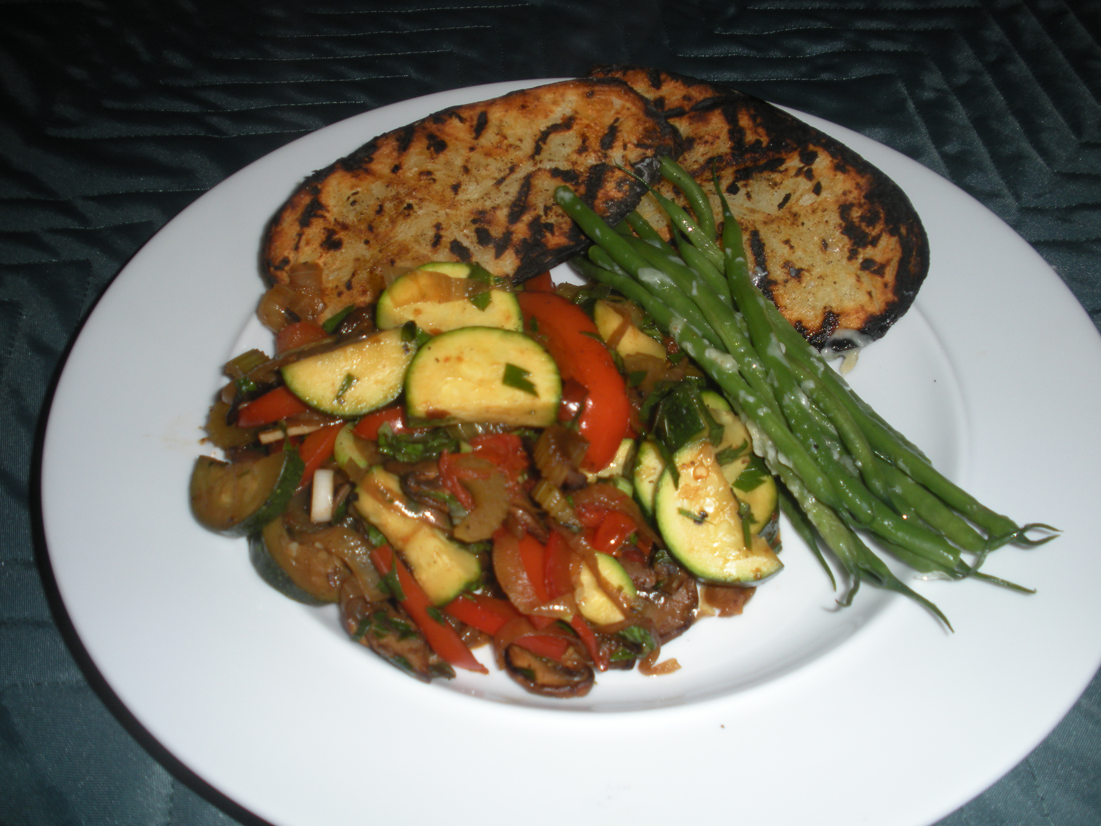 I ate a grilled potato and a bunch of vegetables. John ate the same thing but also added a bean burger. We had a little cheese on the green beans. the end.